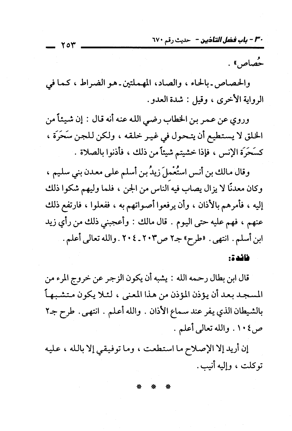 وقال مالك بن أنس استُعْمِلَ زيدُ بن أسلم على معدن بني سليم، وكان معدنًا لا يزال يصاب فيه الناس من الجن، فلما وليهم شكوا ذلك إليه، فأمرهم بالأذان، وأن يرفعوا أصواتهم به، ففعلوا، فارتفع ذلك عنهم، فهم عليه حتى اليوم. قال مالك: وأعجبني ذلك من رأي زيد ابن أسلم. انتهى. "طرح" جـ 2 ص 203 - 204. والله تعالى أعلم.