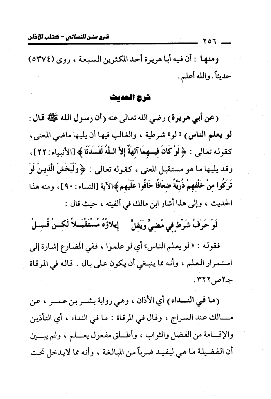 (عن أبي هريرة) رضي الله تعالى عنه (أن رسول الله - صلى الله عليه وسلم - قال: لو يعلم الناس) "لو" شرطية، والغالب فيها أن يليها ماضي المعنى، كقوله تعالى: {لَوْ كَانَ فِيهِمَا آلِهَةٌ إِلَّا اللهُ لَفَسَدَتَا} [الأنبياء: 22]، وقد يليها ما هو مستقبل المعنى، كقوله تعالى: {وَلْيَخْشَ الَّذِينَ لَوْ تَرَكُوا مِنْ خَلْفِهِمْ ذُرِّيَّةً ضِعَافًا خَافُوا عَلَيْهِمْ} الآية [النساء: 9]، ومنه هذا الحديث، وإلى هذا أشار ابن مالك في ألفيته، حيث قال: