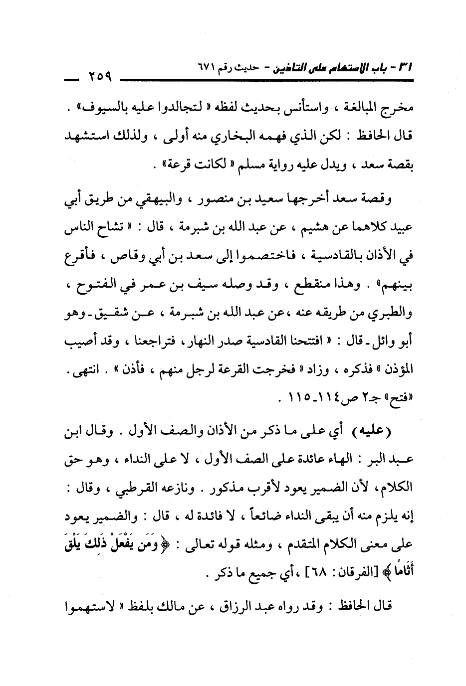 وقصة سعد أخرجها سعيد بن منصور، والبيهقي من طريق أبي عبيد كلاهما عن هشيم، عن عبد الله بن شبرمة، قال: "تشاح الناس في الأذان بالقادسية، فاختصموا إلى سعد بن أبي وقاص، فأقرع بينهم". وهذا منقطع، وقد وصله سيف بن عمر في الفتوح، والطبري من طريقه عنه، عن عبد الله بن شبرمة، عن شقيق -وهو أبو وائل- قال: "افتتحنا القادسية صدر النهار، فتراجعنا، وقد أصيب المؤذن" فذكره، وزاد "فخرجت القرعة لرجل منهم، فأذن". انتهى. "فتح" جـ 2 ص 114 - 115.