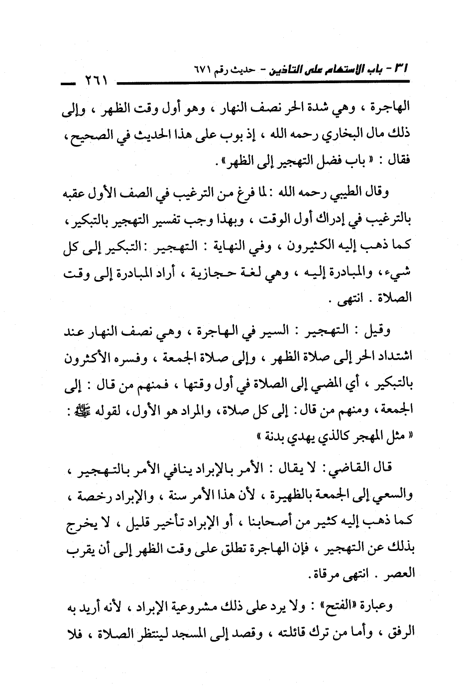 وقال الطيبي -رحمه الله-: لما فرغ من الترغيب في الصف الأول عقبه بالترغيب في إدراك أول الوقت، وبهذا وجب تفسير التهجير بالتبكير، كما ذهب إليه الكثيرون، وفي النهاية: التهجير: التبكير إلى كل شيء، والمبادرة إليه، وهي لغة حجازية، أراد المبادرة إلى وقت الصلاة. انتهى.
