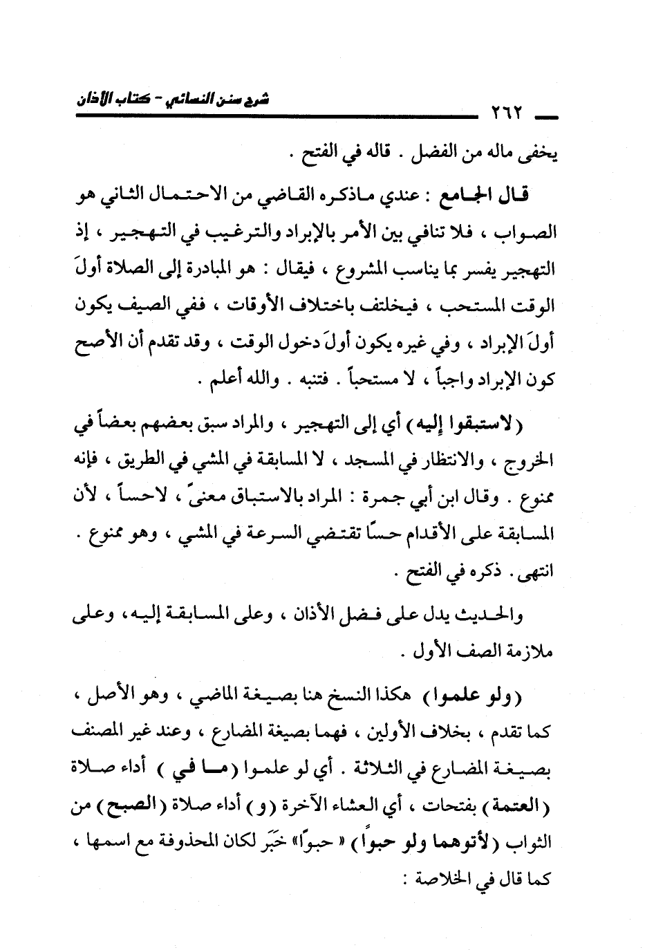 (لاستبقوا إِليه) أي إلى التهجير، والمراد سبق بعضهم بعضًا في الخروج، والانتظار في المسجد، لا المسابقة في المشي في الطريق، فإنه ممنوع. وقال ابن أبي جمرة: المراد بالاستباق معنىً، لاحسًا، لأن المسابقة على الأقدام حسًا تقتضي السرعة في المشي، وهو ممنوع. انتهى. ذكره في الفتح.