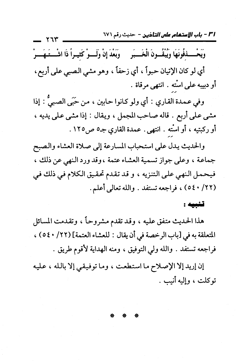 والحديث يدل على استحباب المسارعة إلى صلاة العشاء والصبح جماعة، وعلى جواز تسمية العشاء عتمة، وقد ورد النهي عن ذلك، فيحمل النهي على التنزيه، وقد تقدم تحقيق الكلام في ذلك في (22/ 540)، فراجعه تستفد. والله تعالى أعلم.