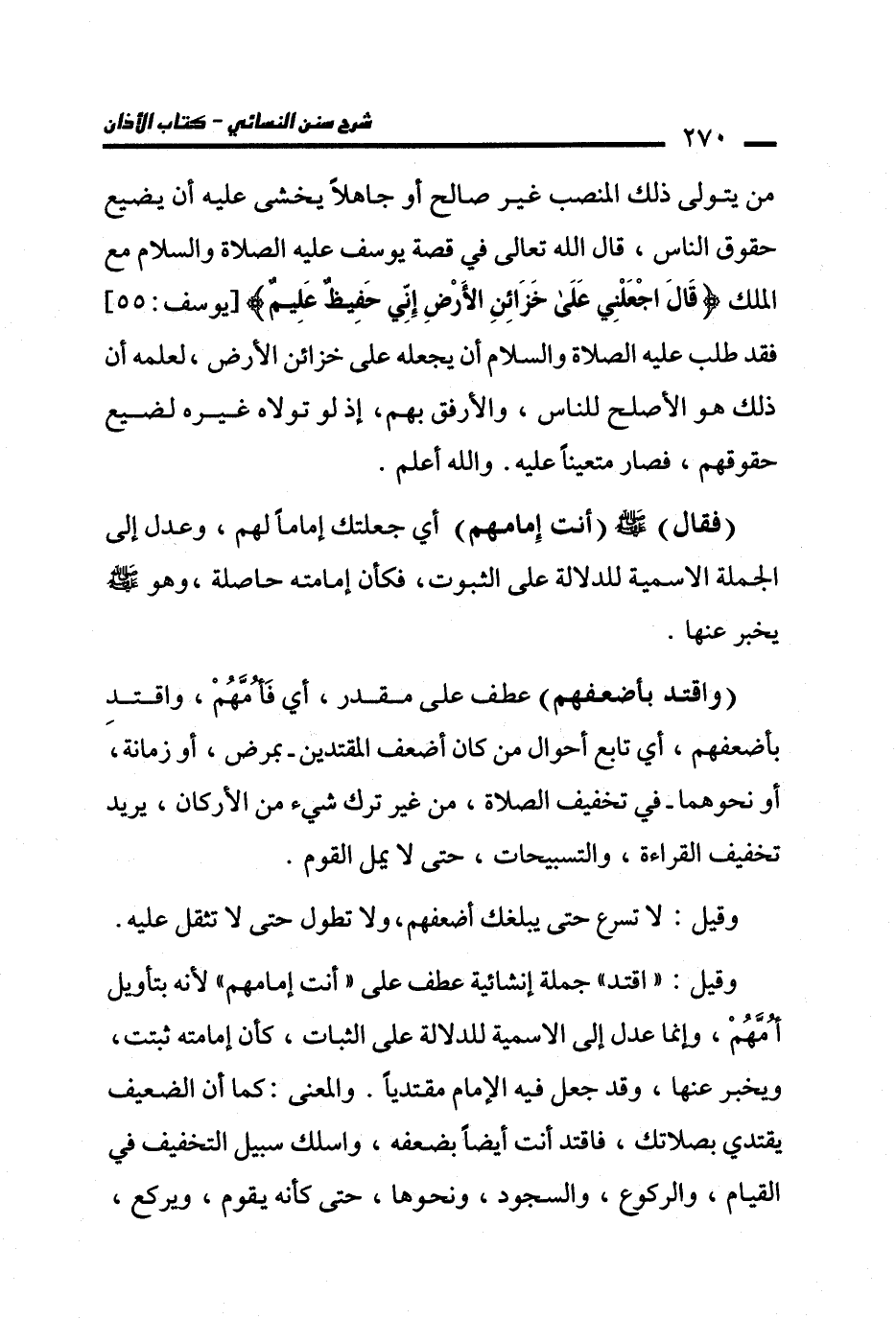 (واقتد بأضعفهم) عطف على مقدر، أي فَأُمَّهُمْ، واقتدِ بأضعفهم، أي تابع أحوال من كان أضعف المقتدين -بمرض، أو زمانة، أو نحوهما- في تخفيف الصلاة، من غير ترك شيء من الأركان، يريد تخفيف القراءة، والتسبيحات، حتى لا يمل القوم.