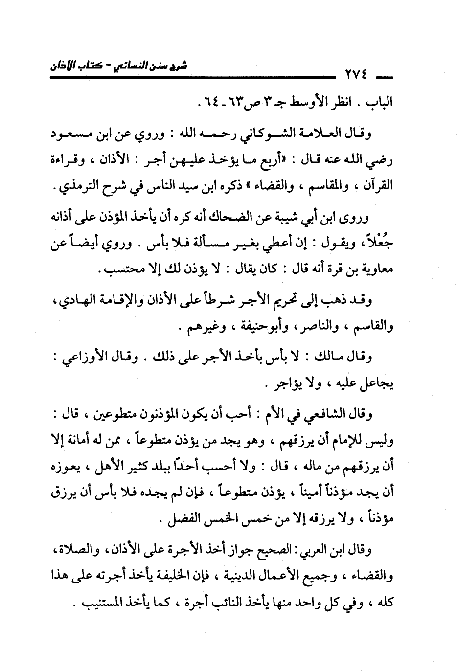 وقال العلامة الشوكاني -رحمه الله-: وروي عن ابن مسعود - رضي الله عنه - قال: "أربع ما يؤخذ عليهن أجر: الأذان، وقراءة القرآن، والمقاسم، والقضاء" ذكره ابن سيد الناس في شرح الترمذي.