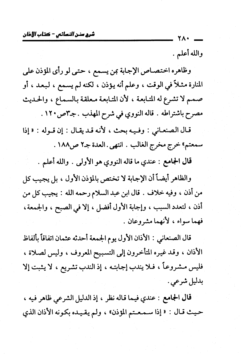 والظاهر أيضًا أن الإجابة لا تختص بالمؤذن الأول، بل يجيب كل من أذن، وفيه خلاف. قال ابن عبد السلام -رحمه الله-: يجيب كل من أذن، لتعدد السبب، وإجابة الأول أفضل، إلا في الصبح، والجمعة، فهما سواء، لأنهما مشروعان.