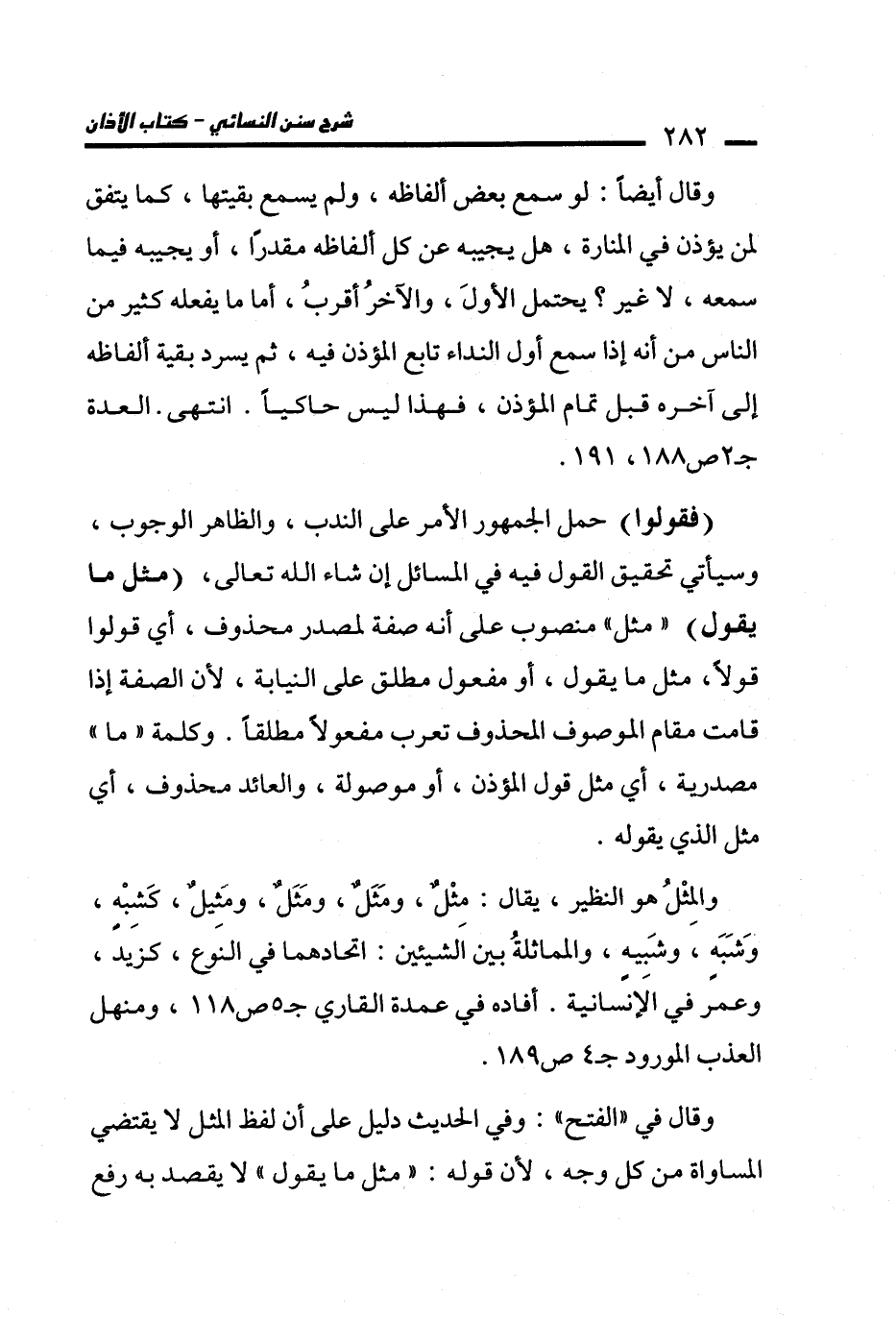 وقال أيضًا: لو سمع بعض ألفاظه، ولم يسمع بقيتها، كما يتفق لمن يؤذن في المنارة، هل يجيبه عن كل ألفاظه مقدرًا، أو يجيبه فيما سمعه، لا غير؟ يحتمل الأولَ، والآخرُ أقربُ، أما ما يفعله كثير من الناس من أنه إذا سمع أول النداء تابع المؤذن فيه، ثم يسرد بقية ألفاظه إلى آخره قبل تمام المؤذن، فهذا ليس حاكيًا. انتهى. العدة جـ 2 ص 188، 191.