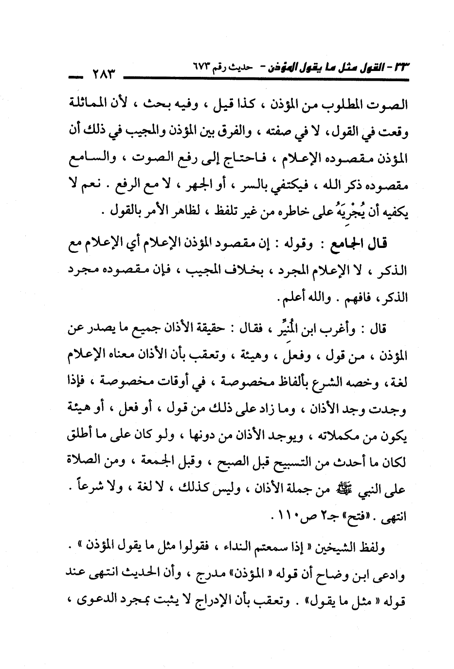 وادعى ابن وضاح أن قوله "المؤذن" مدرج، وأن الحديث انتهى عند قوله "مثل ما يقول". وتعقب بأن الإدراج لا يثبت بمجرد الدعوى،