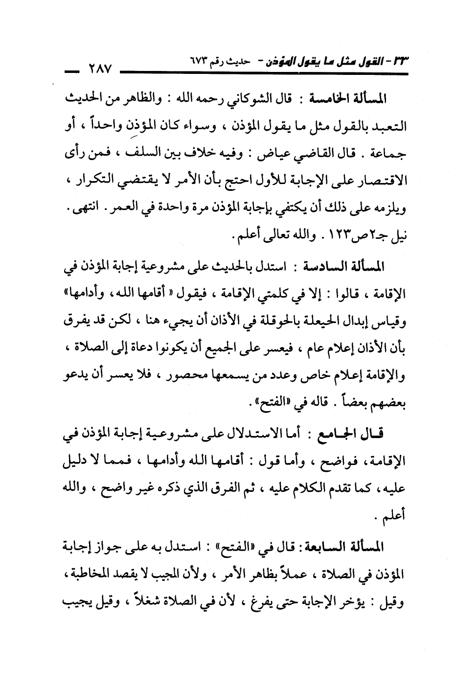 المسألة الخامسة: قال الشوكاني -رحمه الله-: والظاهر من الحديث التعبد بالقول مثل ما يقول المؤذن، وسواء كان المؤذن واحدًا، أو جماعة. قال القاضي عياض: وفيه خلاف بين السلف، فمن رأى الاقتصار على الإجابة للأول احتج بأن الأمر لا يقتضي التكرار، ويلزمه على ذلك أن يكتفي بإجابة المؤذن مرة واحدة في العمر. انتهى. نيل جـ 2 ص 123. والله تعالى أعلم.