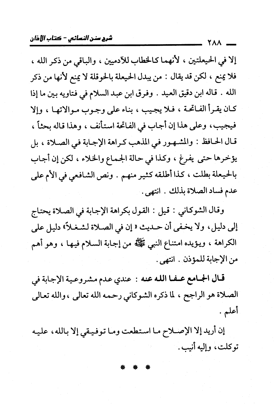 قال الجامع عفا الله عنه: عندي عدم مشروعية الإجابة في الصلاة هو الراجح، لما ذكره الشوكاني رحمه الله تعالى، والله تعالى أعلم.