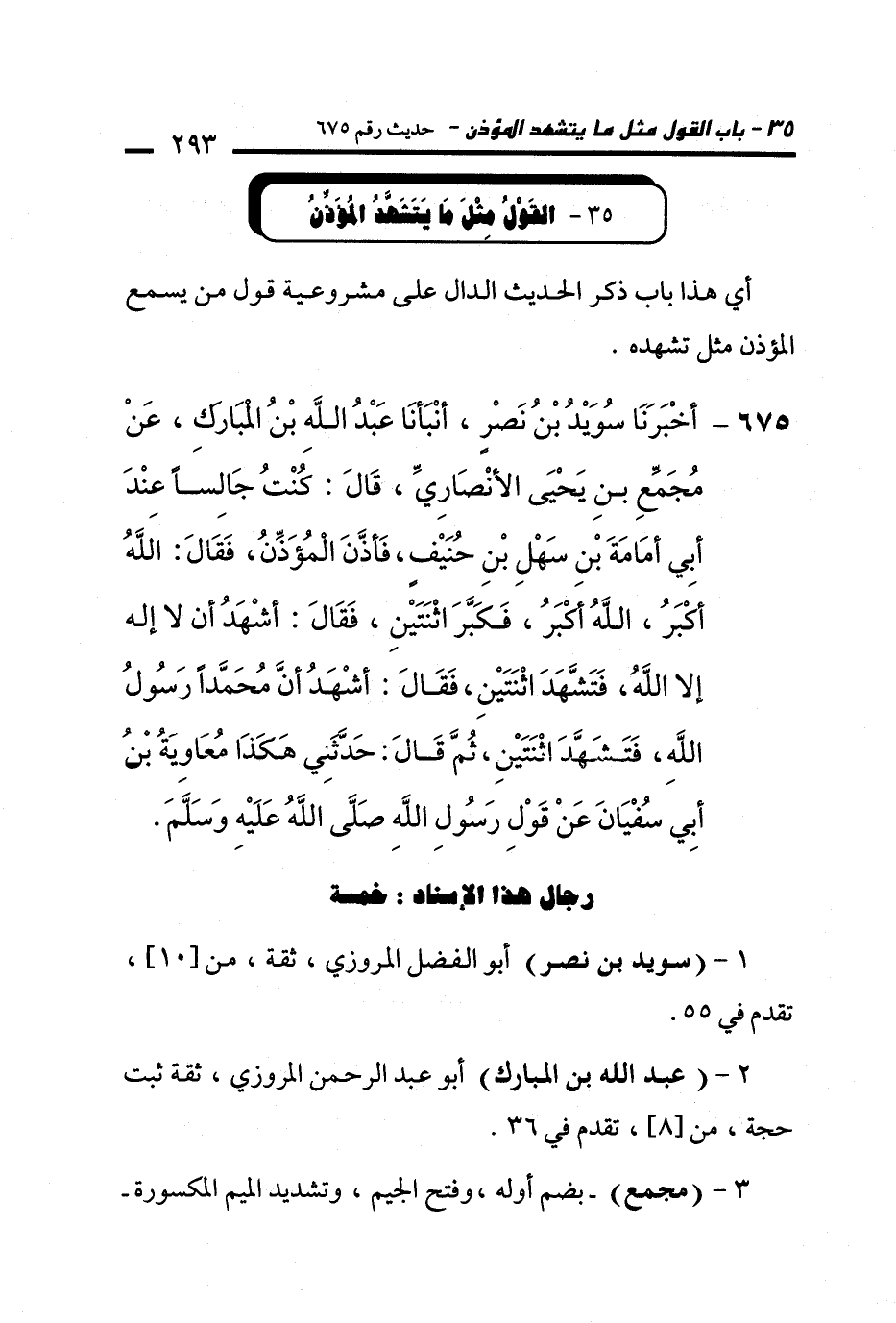 675 - أَخْبَرَنَا سُوَيْدُ بْنُ نَصْرٍ، أَنْبَأَنَا عَبْدُ اللَّهِ بْنُ الْمُبَارَكِ، عَنْ مُجَمِّعِ بْنِ يَحْيَى الأَنْصَارِيِّ، قَالَ: كُنْتُ جَالِسًا عِنْدَ أَبِي أُمَامَةَ بْنِ سَهْلِ بْنِ حُنَيْفٍ، فَأَذَّنَ الْمُؤَذِّنُ، فَقَالَ: اللَّهُ أَكْبَرُ، اللَّهُ أَكْبَرُ، فَكَبَّرَ اثْنَتَيْنِ، فَقَالَ: أَشْهَدُ أَنْ لاَ إِلَهَ إِلاَّ اللَّهُ، فَتَشَهَّدَ اثْنَتَيْنِ، فَقَالَ: أَشْهَدُ أَنَّ مُحَمَّدًا رَسُولُ اللَّهِ، فَتَشَهَّدَ اثْنَتَيْنِ، ثُمَّ قَالَ: حَدَّثَنِي هَكَذَا مُعَاوِيَةُ بْنُ أَبِي سُفْيَانَ عَنْ قَوْلِ رَسُولِ اللَّهِ - صلى الله عليه وسلم -.