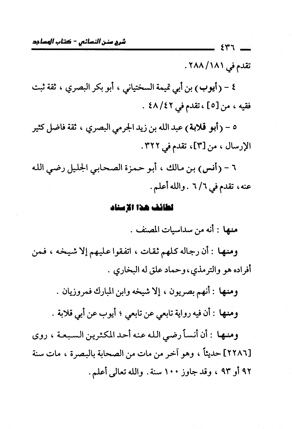 ومنها: أن رجاله كلهم ثقات، اتفقوا عليهم إلا شيخه، فمن أفراده هو والترمذي، وحماد علق له البخاري.