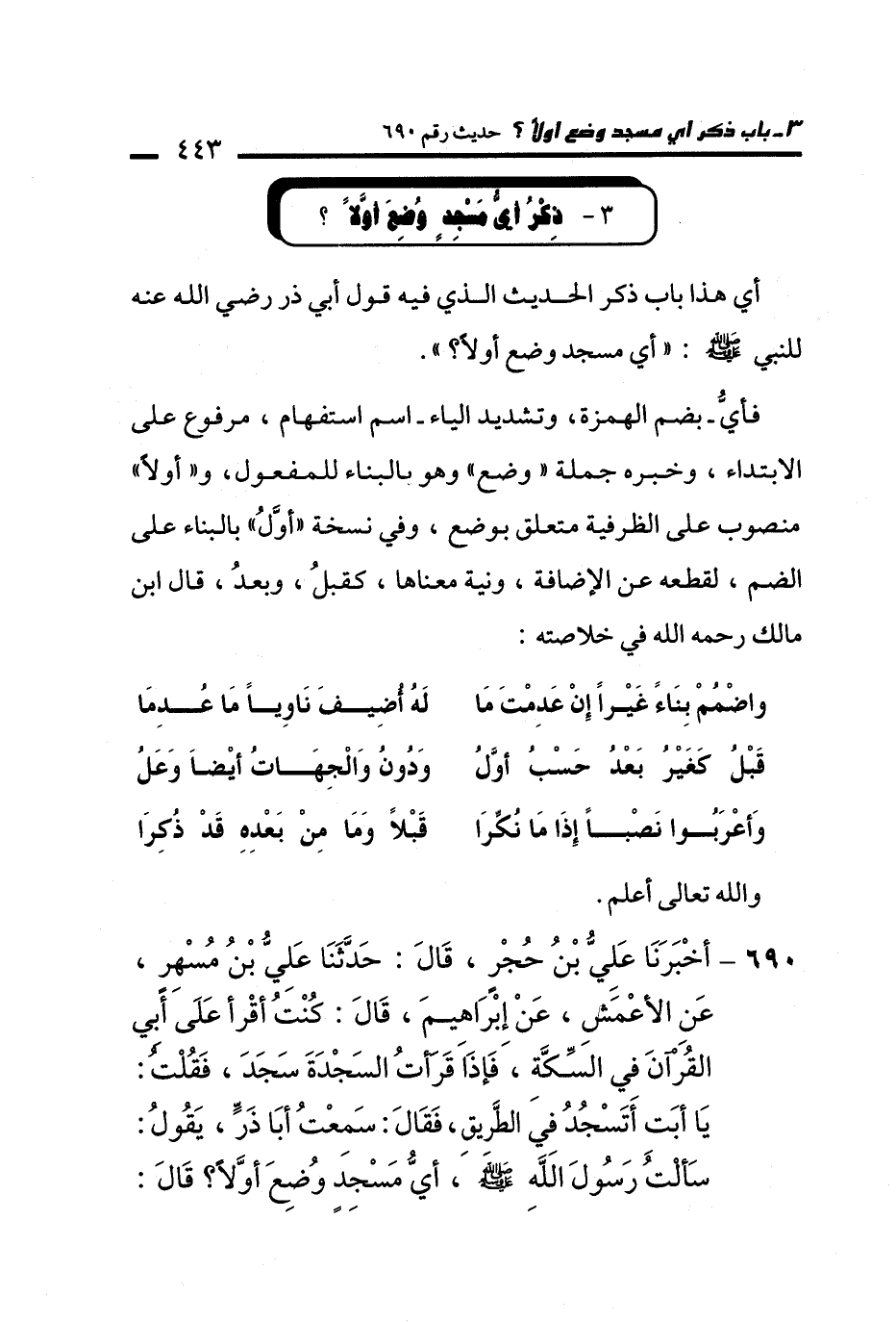690 - أَخْبَرَنَا عَلِيُّ بْنُ حُجْرٍ، قَالَ: حَدَّثَنَا عَلِيُّ بْنُ مُسْهِرٍ، عَنِ الأَعْمَشِ، عَنْ إِبْرَاهِيمَ، قَالَ: كُنْتُ أَقْرَأُ عَلَى أَبِي الْقُرْآنَ فِي السِّكَّةِ، فَإِذَا قَرَأْتُ السَّجْدَةَ سَجَدَ، فَقُلْتُ: يَا أَبَتِ أَتَسْجُدُ فِي الطَّرِيقِ، فَقَالَ: إِنِّي سَمِعْتُ أَبَا ذَرٍّ، يَقُولُ: سَأَلْتُ رَسُولَ اللَّهِ - صلى الله عليه وسلم -، أَيُّ مَسْجِدٍ وُضِعَ أَوَّلاً؟ قَالَ: