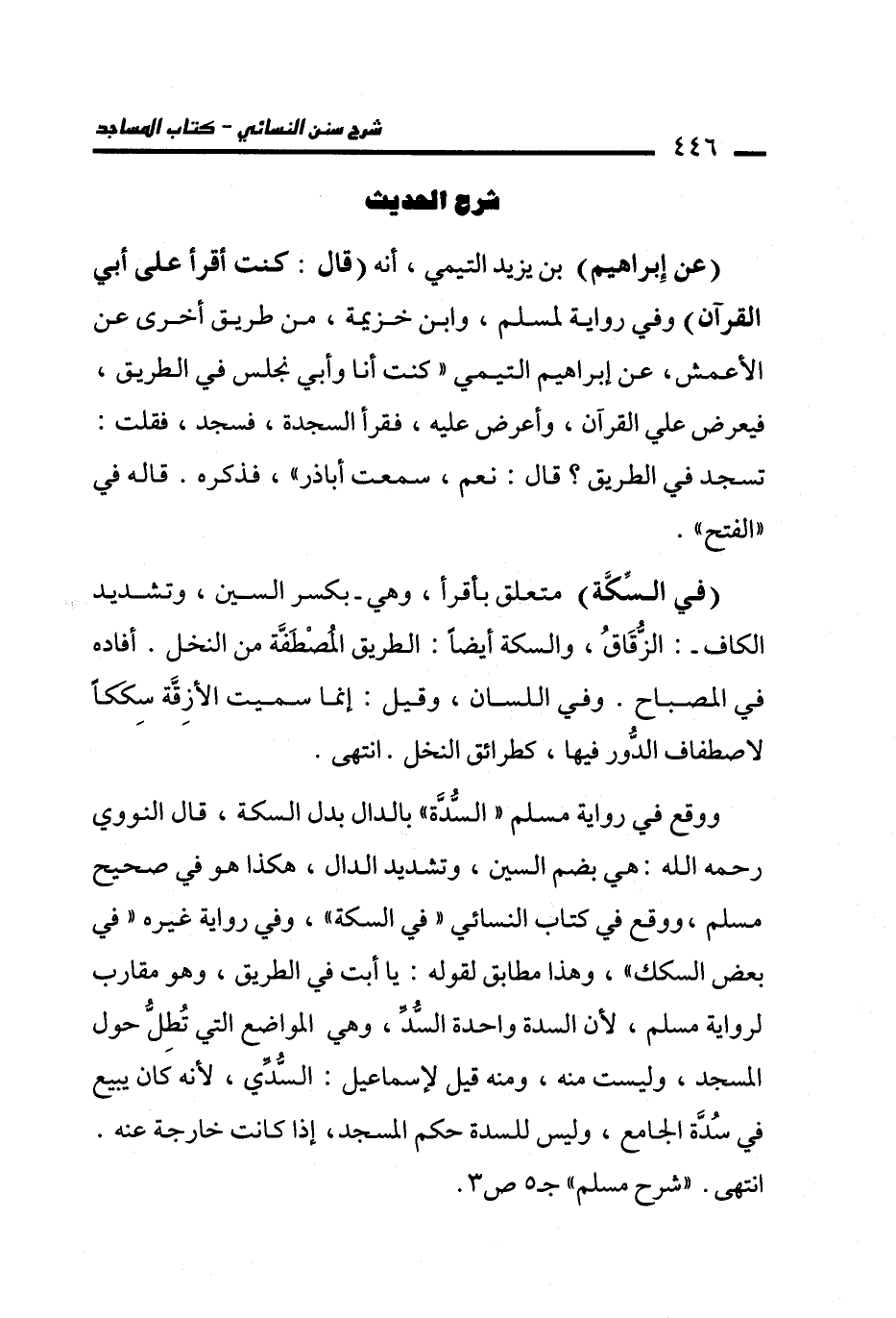 ووقع في رواية مسلم "السُّدَّة" بالدال بدل السكة، قال النووي -رحمه الله-: هي بضم السين، وتشديد الدال، هكذا هو في صحيح مسلم، ووقع في كتاب النسائي "في السكة"، وفي رواية غيره "في بعض السكك"، وهذا مطابق لقوله: يا أبت في الطريق، وهو مقارب لرواية مسلم؛ لأن السدة واحدة السُّدِّ، وهي المواضع التي تُطِلُّ حول المسجد، وليست منه، ومنه قيل لإسماعيل: السُّدِّي؛ لأنه كان يبيع في سُدَّة الجامع، وليس للسدة حكم المسجد، إذا كانت خارجة عنه. انتهى. "شرح مسلم" جـ 5 ص 3.