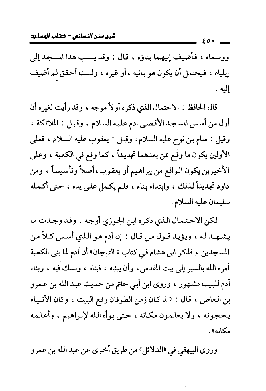 لكن الاحتمال الذي ذكره ابن الجوزي أوجه. وقد وجدت ما كشهد له، ويؤيد قول من قال: إن آدم هو الذي أسس كلًا من المسجدين، فذكر ابن هشام في كتاب "التيجان" أن آدم لما بني الكعبة أمره الله بالسير إلى بيت المقدس، وأن يبنيه، فبناه، ونسك فيه، وبناء آدم للبيت مشهور، وروى ابن أبي حاتم من حديث عبد الله بن عمرو بن العاص، قال: "لما كان زمن الطوفان رفع البيت، وكان الأنبياء يحجونه، ولا يعلمون مكانه، حتى بوأه الله لإبراهيم، وأعلمه مكانه".
