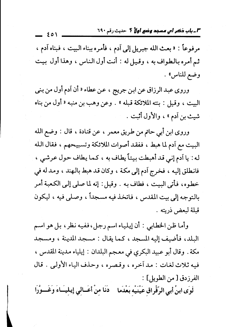 وأما ظن الخطابي: أن إيلياء اسم رجل، ففيه نظر، بل هو اسم البلد، فأضيف إليه المسجد، كما يقال: مسجد المدينة، ومسجد مكة. وقال أبو عبيد البكري في معجم البلدان: إيلياء مدينة المقدس، فيه ثلاث لغات: مد آخره، وقصره، وحذف الياء الأولى. قال الفرزدق [من الطويل]: