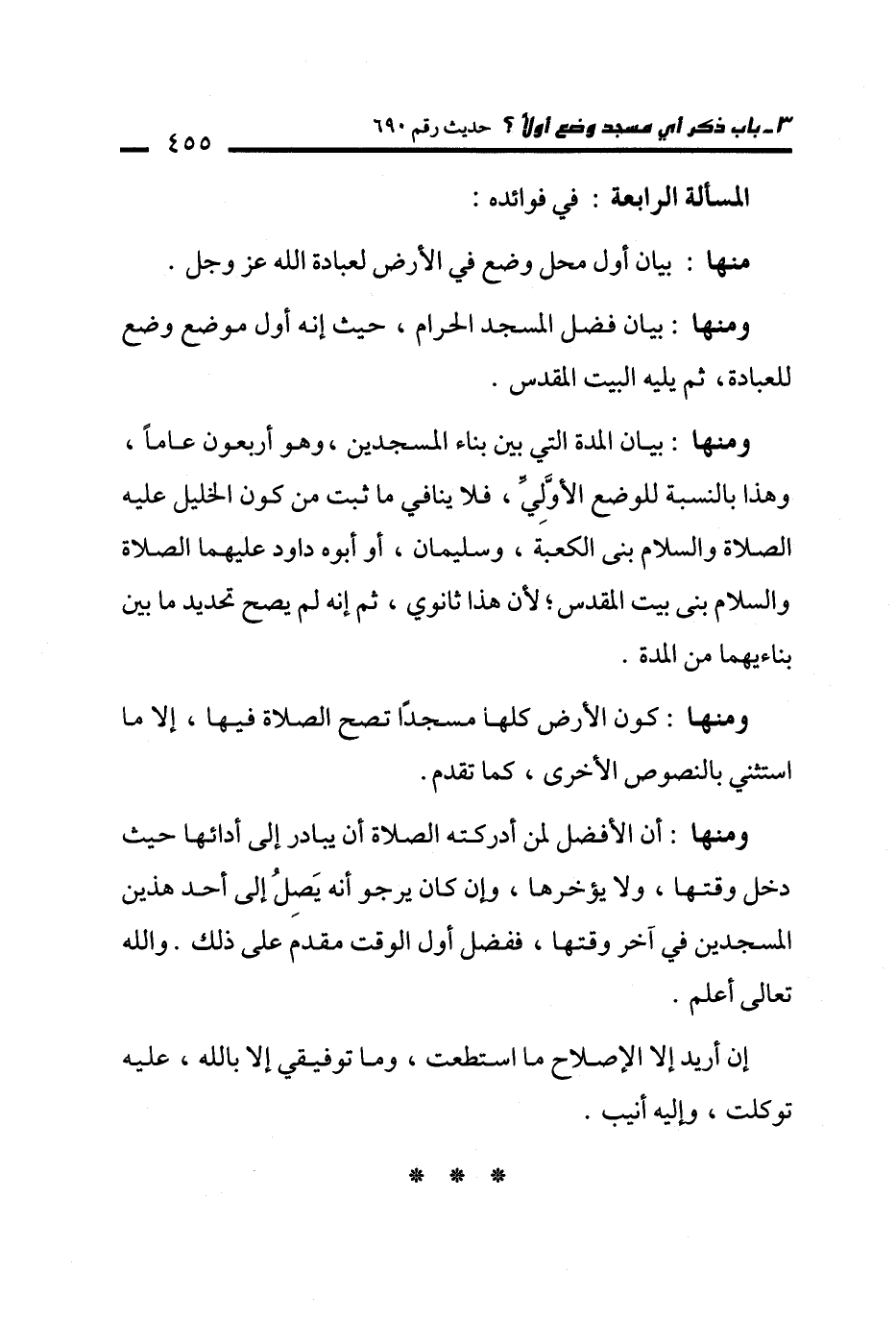 ومنها: بيان المدة التي بين بناء المسجدين، وهو أربعون عامًا، وهذا بالنسبة للوضع الأوَّلِيِّ، فلا ينافي ما ثبت من كون الخليل عليه الصلاة والسلام بني الكعبَة، وسليمان، أو أبوه داود عليهما الصلاة والسلام بنى بيت المقدس؛ لأن هذا ثانوي، ثم إنه لم يصح تحديد ما بين بناءيهما من المدة.