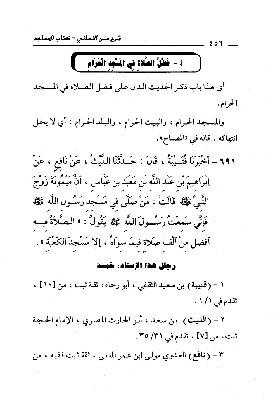 691 - أَخْبَرَنَا قُتَيْبَةُ، قَالَ: حَدَّثَنَا اللَّيْثُ، عَنْ نَافِعٍ، عَنْ إِبْرَاهِيمَ بْنِ عَبْدِ اللَّهِ بْنِ مَعْبَدِ بْنِ عَبَّاسٍ، أَنَّ مَيْمُونَةَ زَوْجَ النَّبِيِّ - صلى الله عليه وسلم - قَالَتْ: مَنْ صَلَّى فِي مَسْجِدِ رَسُولِ اللَّهِ - صلى الله عليه وسلم - فَإِنّيِ سَمِعْتُ رَسُولَ اللَّهِ - صلى الله عليه وسلم - يَقُولُ: "الصَّلاَةُ فِيهِ أَفْضَلُ مِنْ أَلْفِ صَلاَةٍ فِيمَا سِوَاهُ، إِلاَّ مَسْجِدَ الْكَعْبَةِ".
