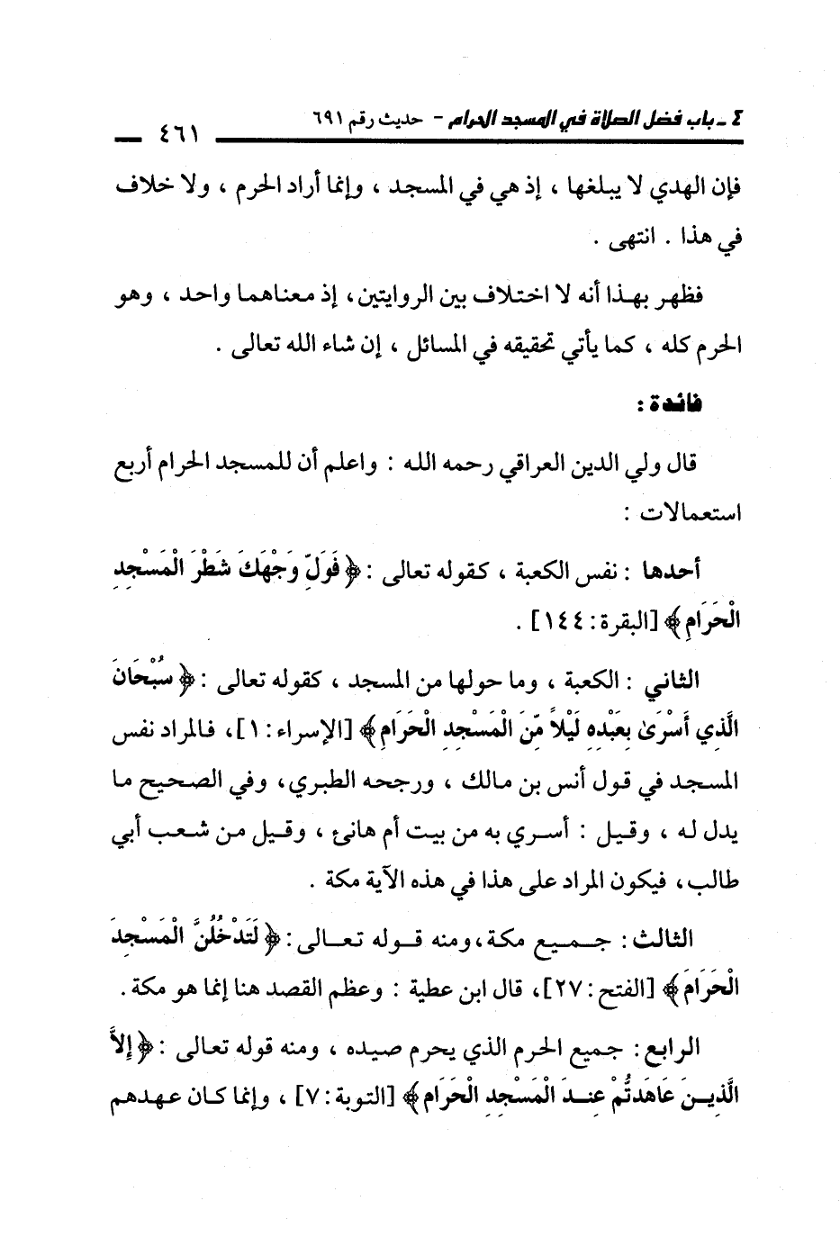 قال ولي الدين العراقي -رحمه الله-: واعلم أن للمسجد الحرام أربع استعمالات: