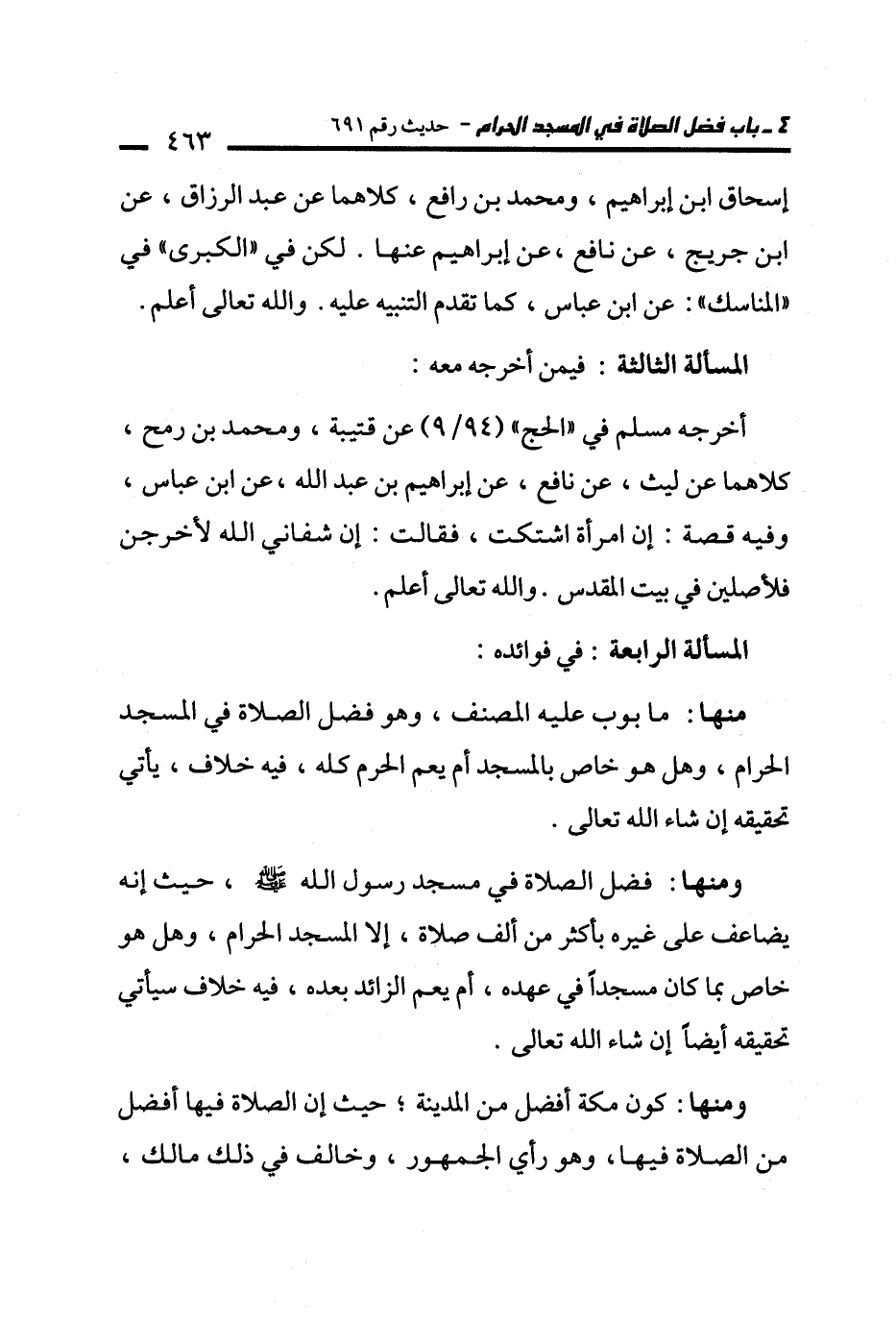 ومنها: فضل الصلاة في مسجد رسول الله - صلى الله عليه وسلم -، حيث إنه يضاعف على غيره بأكثر من ألف صلاة، إلا المسجد الحرام، وهل هو خاص بما كان مسجدًا في عهده، أم يعم الزائد بعده، فيه خلاف سيأتي تحقيقه أيضًا إن شاء الله تعالى.