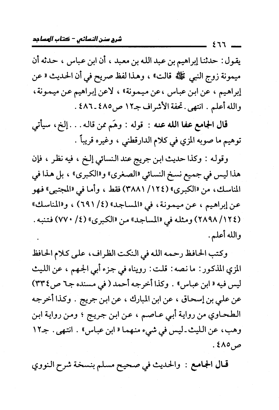 وقوله: وكذا حديث ابن جريج عند النسائي إلخ، فيه نظر، فإن هذا ليس في جميع نسخ النسائي "الصغرى" و"الكبرى"، بل هذا في المناسك، من "الكبرى" (124/ 3881) فقط، وأما في "المجتبى" فهو عن إبراهيم، عن ميمونة، في "المساجد" (4/ 691)، و"المناسك" (2898/ 124) ومثله في "المساجد" من "الكبرى" (4/ 770) فتنبه. والله أعلم.