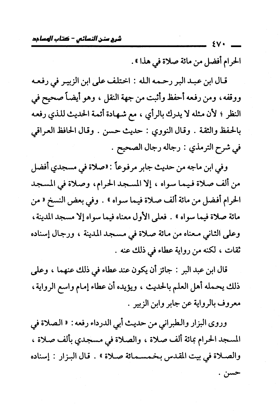 وروى البزار والطبراني من حديث أبي الدرداء رفعه: "الصلاة في المسجد الحرام بمائة ألف صلاة، والصلاة في مسجدي بألف صلاة، والصلاة في بيت المقدس بخمسمائة صلاة". قال البزار: إسناده حسن.