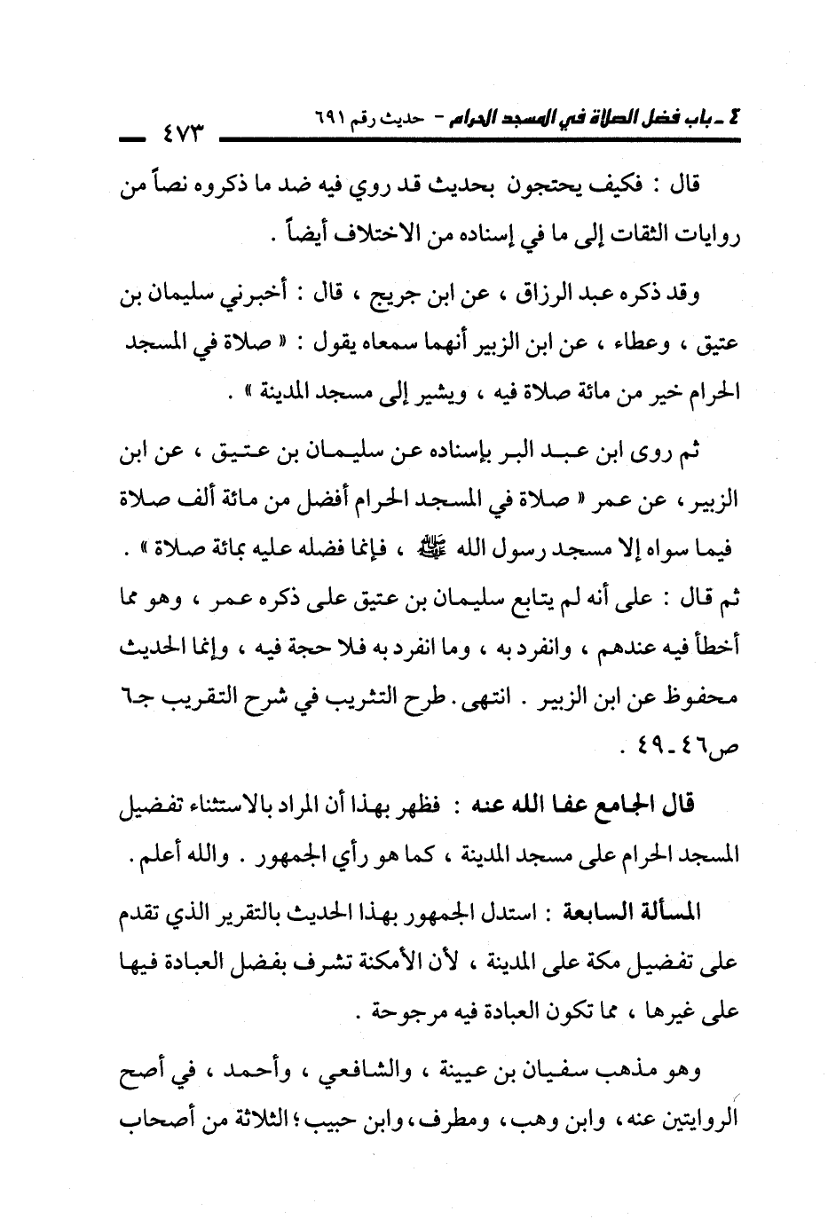 ثم روى ابن عبد البر بإسناده عن سليمان بن عتيق، عن ابن الزبير، عن عمر "صلاة في المسجد الحرام أفضل من مائة ألف صلاة فيما سواه إلا مسجد رسول الله - صلى الله عليه وسلم -، فإنما فضله عليه بمائة صلاة".