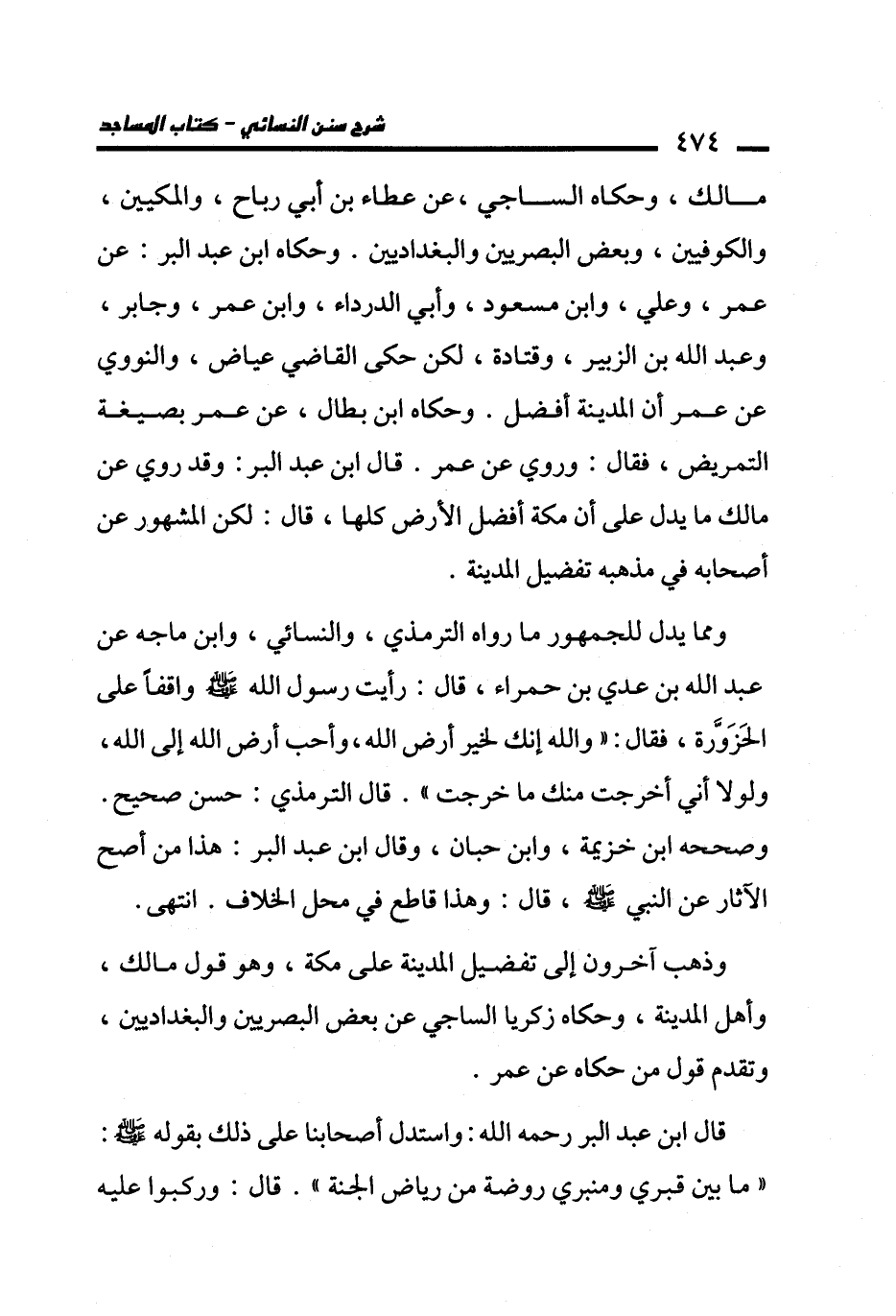ومما يدل للجمهور ما رواه الترمذي، والنسائي، وابن ماجه عن عبد الله بن عدي بن حمراء، قال: رأيت رسول الله - صلى الله عليه وسلم - واقفًا على الحَزَوَّرة، فقال: "والله إنك لخير أرض الله، وأحب أرض الله إلى الله، ولولا أني أخرجت منك ما خرجت". قال الترمذي: حسن صحيح. وصححه ابن خزيمة، وابن حبان، وقال ابن عبد البر: هذا من أصح الآثار عن النبي - صلى الله عليه وسلم -، قال: وهذا قاطع في محل الخلاف. انتهى.