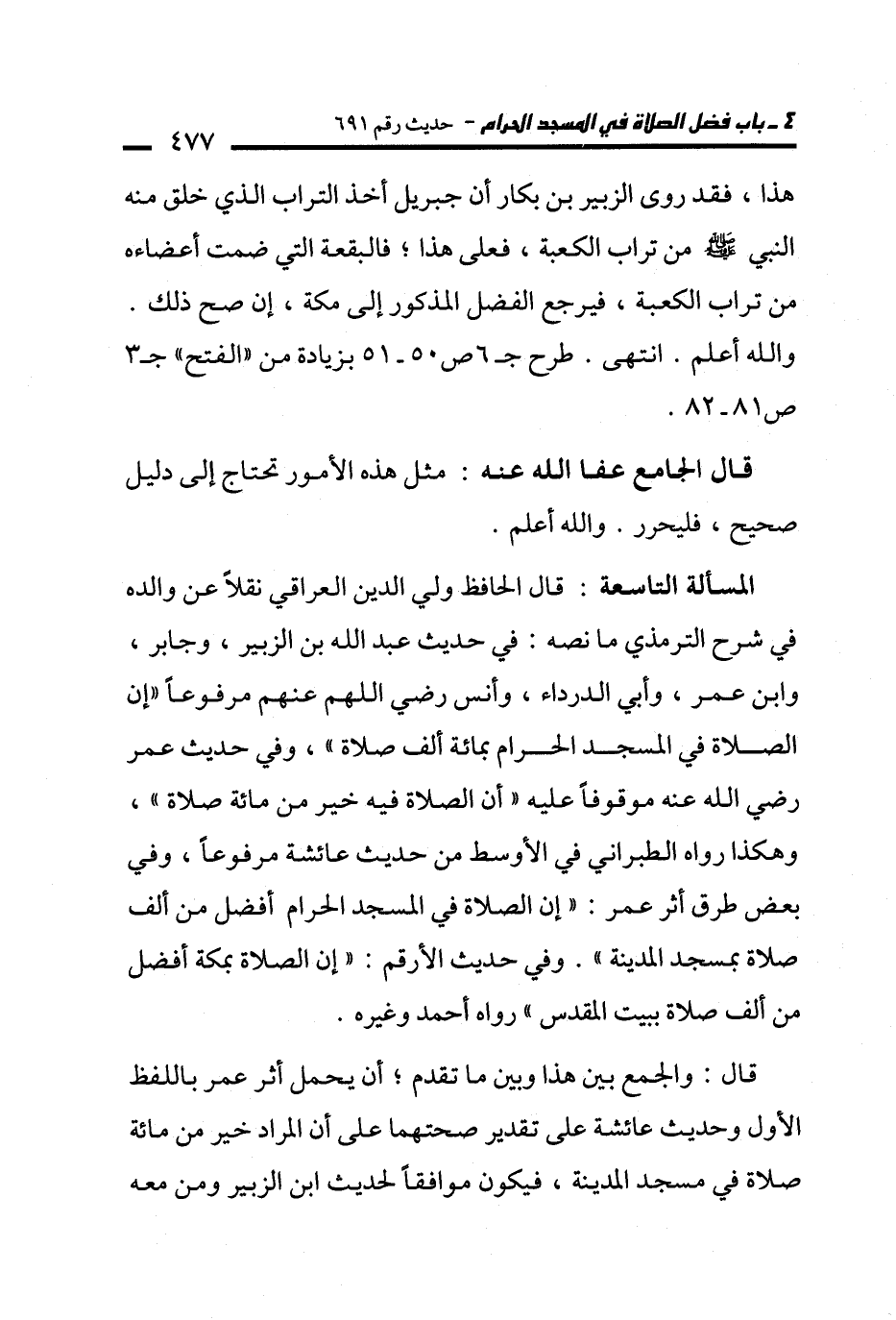 المسألة التاسعة: قال الحافظ ولي الدين العراقي نقلًا عن والده في شرح الترمذي ما نصه: في حديث عبد الله بن الزبير، وجابر، وابن عمر، وأبي الدرداء، وأنس رضي اللهم عنهم مرفوعًا "إن الصلاة في المسجد الحرام بمائة ألف صلاة"، وفي حديث عمر - رضي الله عنه - موقوفًا عليه "أن الصلاة فيه خير من مائة صلاة"، وهكذا رواه الطبراني في الأوسط من حديث عائشة مرفوعًا، وفي بعض طرق أثر عمر: "إن الصلاة في المسجد الحرام أفضل من ألف صلاة بمسجد المدينة". وفي حديث الأرقم: "إن الصلاة بمكة أفضل من ألف صلاة ببيت المقدس" رواه أحمد وغيره.
