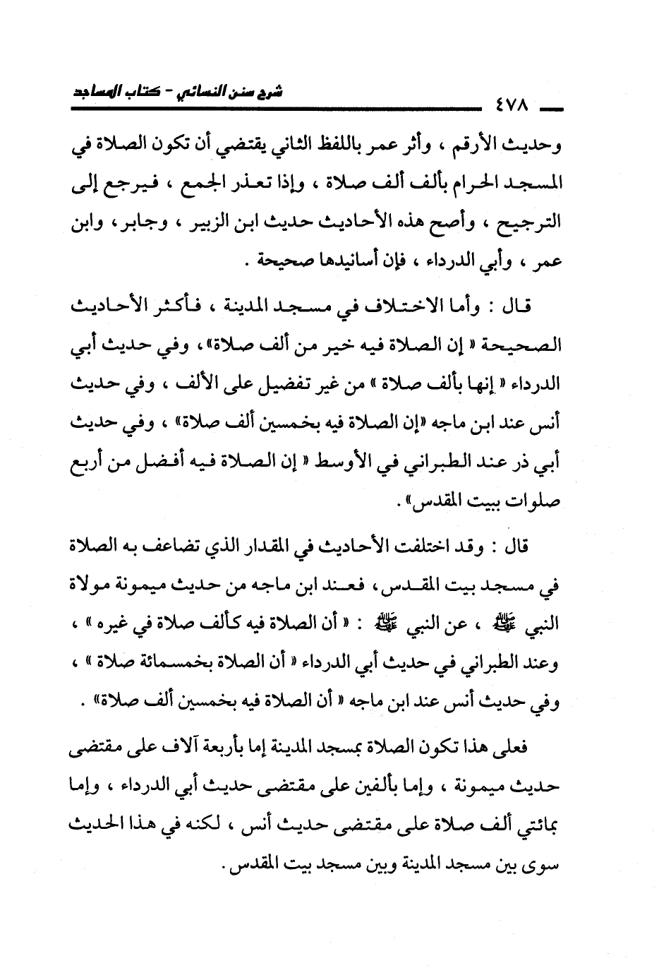 قال: وقد اختلفت الأحاديث في المقدار الذي تضاعف به الصلاة في مسجد بيت المقدس، فعند ابن ماجه من حديث ميمونة مولاة النبي - صلى الله عليه وسلم -، عن النبي - صلى الله عليه وسلم -: "أن الصلاة فيه كألف صلاة في غيره"، وعند الطبراني في حديث أبي الدرداء "أن الصلاة بخمسمائة صلاة"، وفي حديث أنس عند ابن ماجه "أن الصلاة فيه بخمسين ألف صلاة".