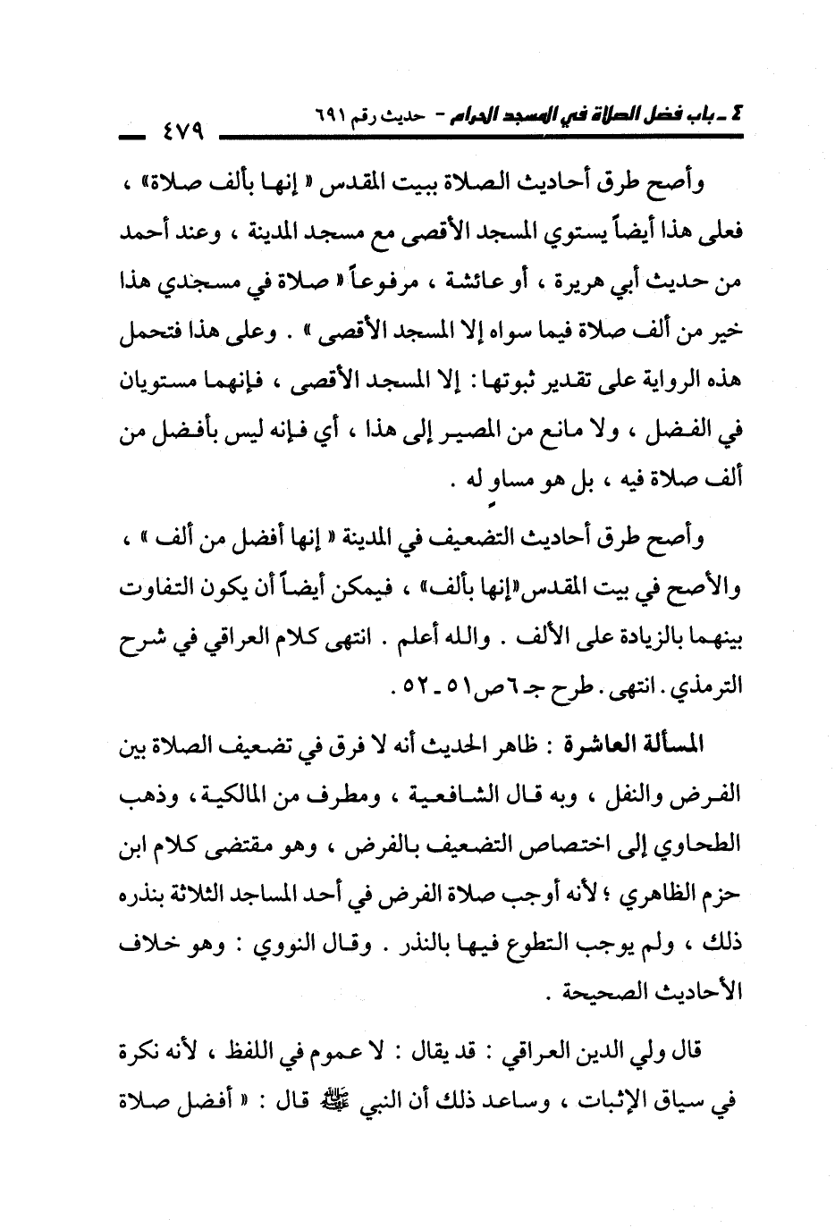 وأصح طرق أحاديث التضعيف في المدينة "إنها أفضل من ألف"، والأصح في بيت المقدس "إنها بألف"، فيمكن أيضًا أن يكون التفاوت بينهما بالزيادة على الألف. والله أعلم. انتهى كلام العراقي في شرح الترمذي. انتهى. طرح جـ 6 ص 51 - 52.