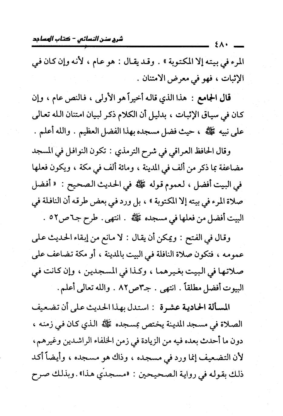 قال الجامع: هذا الذي قاله أخيرًا هو الأولى، فالنص عام، وإن كان في سياق الإثبات، بدليل أن الكلام ذكر لبيان امتنان الله تعالى على نبيه - صلى الله عليه وسلم -، حيث فضل مسجده بهذا الفضل العظيم. والله أعلم.