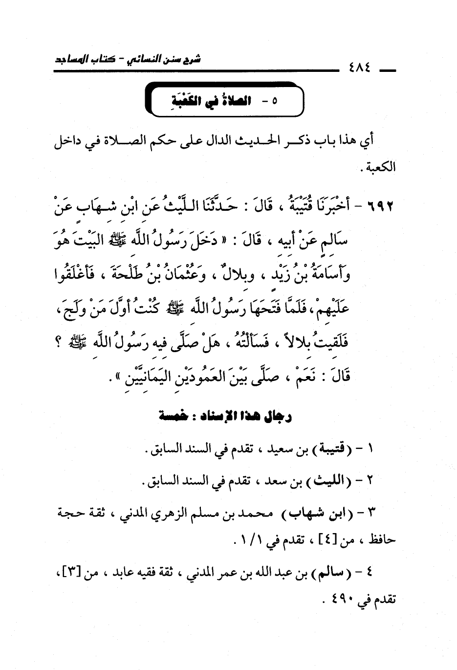 692 - أَخْبَرَنَا قُتَيْبَةُ، قَالَ: حَدَّثَنَا اللَّيْثُ عَنِ ابْنِ شِهَابٍ عَنْ سَالِمٍ عَنْ أَبِيهِ، قَالَ: "دَخَلَ رَسُولُ اللَّهِ - صلى الله عليه وسلم - الْبَيْتَ هُوَ وَأُسَامَةُ بْنُ زَيْدٍ، وَبِلاَلٌ، وَعُثْمَانُ بْنُ طَلْحَةَ، فَأَغْلَقُوا عَلَيْهِمْ، فَلَمَّا فَتَحَهَا رَسُولُ اللَّهِ - صلى الله عليه وسلم - كُنْتُ أَوَّلَ مَنْ وَلَجَ، فَلَقِيتُ بِلاَلاً، فَسَأَلْتُهُ، هَلْ صَلَّى فِيهِ رَسُولُ اللَّهِ - صلى الله عليه وسلم -؟ قَالَ: نَعَمْ، صَلَّى بَيْنَ الْعَمُودَيْنِ الْيَمَانِيَيْنِ".