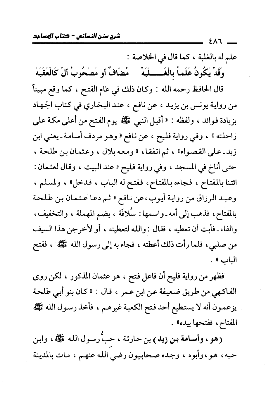 قال الحافظ -رحمه الله-: وكان ذلك في عام الفتح، كما وقع مبينًا من رواية يونس بن يزيد، عن نافع، عند البخاري في كتاب الجهاد بزيادة فوائد، ولفظه: "أقبل النبي - صلى الله عليه وسلم - يوم الفتح من أعلى مكة على راحلته"، وفي رواية فليح، عن نافع "وهو مردف أسامة -يعني ابن زيد- على القصواء"، ثم اتفقا، "ومعه بلال، وعثمان بن طلحة، حتى أناخ في المسجد، وفي رواية فليح "عند البيت، وقال لعثمان: ائتنا بالمفتاح، فجاءه بالمفتاح، ففتح له الباب، فدخل"، ولمسلم، وعبد الرزاق من رواية أيوب، عن نافع "ثم دعا عثمان بن طلحة بالمفتاح، فذهب إلى أمه -واسمها: سُلافَة، بضم المهملة، والتخفيف، والفاء- فأبت أن تعطيه، فقال: والله لتعطينه، أو لأخرجن هذا السيف من صلبي، فلما رأت ذلك أعطته، فجاء به إلى رسول الله - صلى الله عليه وسلم -، ففتح الباب".