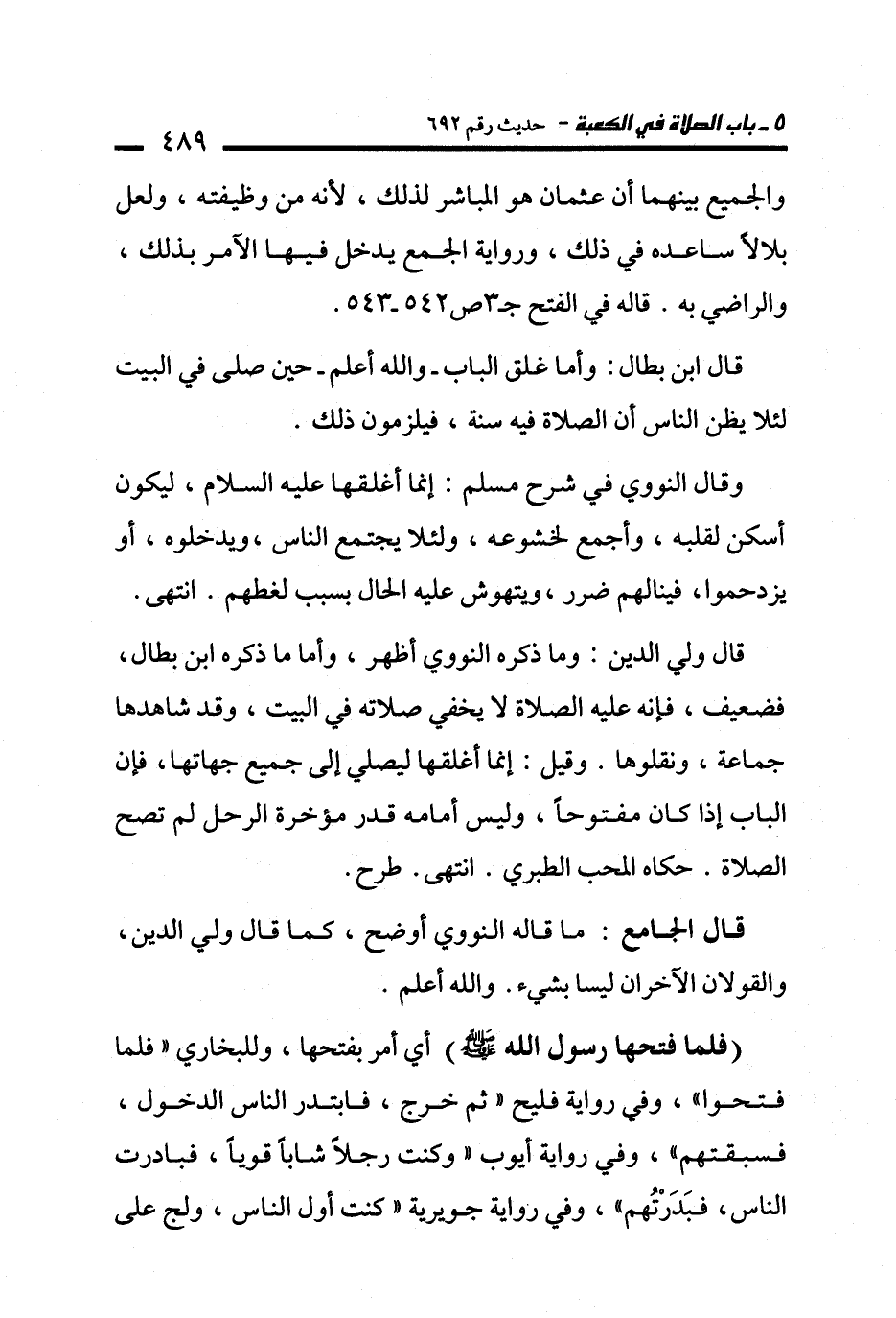 قال ولي الدين: وما ذكره النووي أظهر، وأما ما ذكره ابن بطال، فضعيف، فإنه عليه الصلاة لا يخفي صلاته في البيت، وقد شاهدها جماعة، ونقلوها. وقيل: إنما أغلقها ليصلي إلى جميع جهاتها، فإن الباب إذا كان مفتوحًا، وليس أمامه قدر مؤخرة الرحل لم تصح الصلاة. حكاه المحب الطبري. انتهى. طرح.