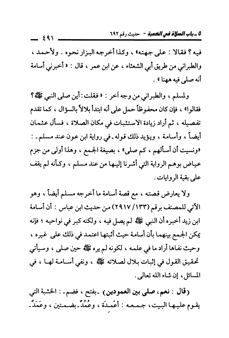 ولا يعارض قصته، مع قصة أسامة ما أخرجه مسلم أيضًا، وهو الآتي للمصنف برقم (133/ 2917) من حديث ابن عباس: أن أسامة ابن زيد أخبره أن النبي - صلى الله عليه وسلم - لم يصل فيه، ولكنه كبر في نواحيه؛ فإنه يمكن الجمع بينهما بأن أسامة حيث أثبتها اعتمد في ذلك على غيره، وحيث نفاها أراد ما في علمه، لكونه لم يره - صلى الله عليه وسلم - حين صلى، وسيأتي تحقيق القول في إثبات بلال لصلاته - صلى الله عليه وسلم -، ونفي أسامة لها، في المسائل، إن شاء الله تعالى.