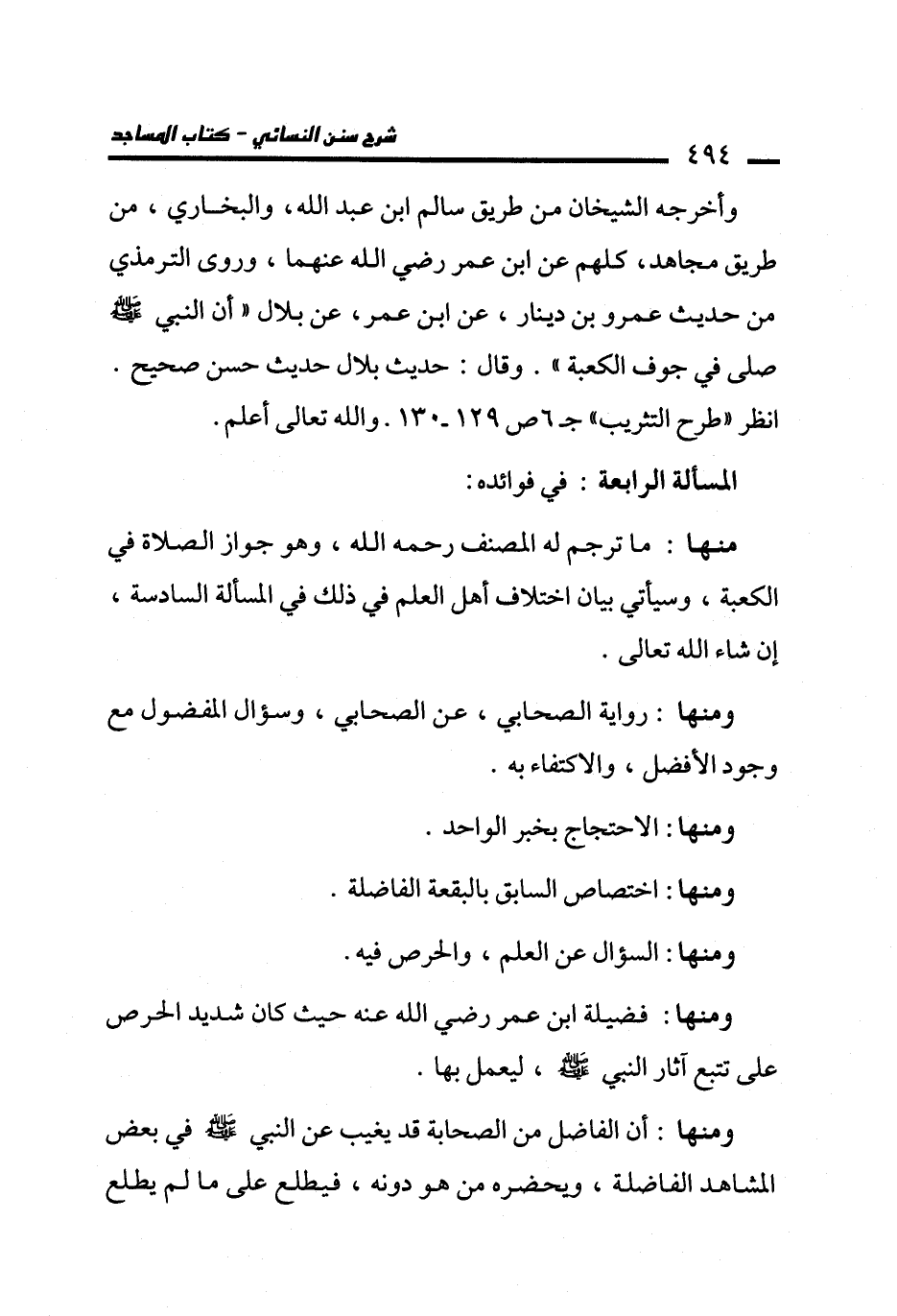 منها: ما ترجم له المصنف -رحمه الله-، وهو جواز الصلاة في الكعبة، وسيأتي بيان اختلاف أهل العلم في ذلك في المسألة السادسة، إن شاء الله تعالى.