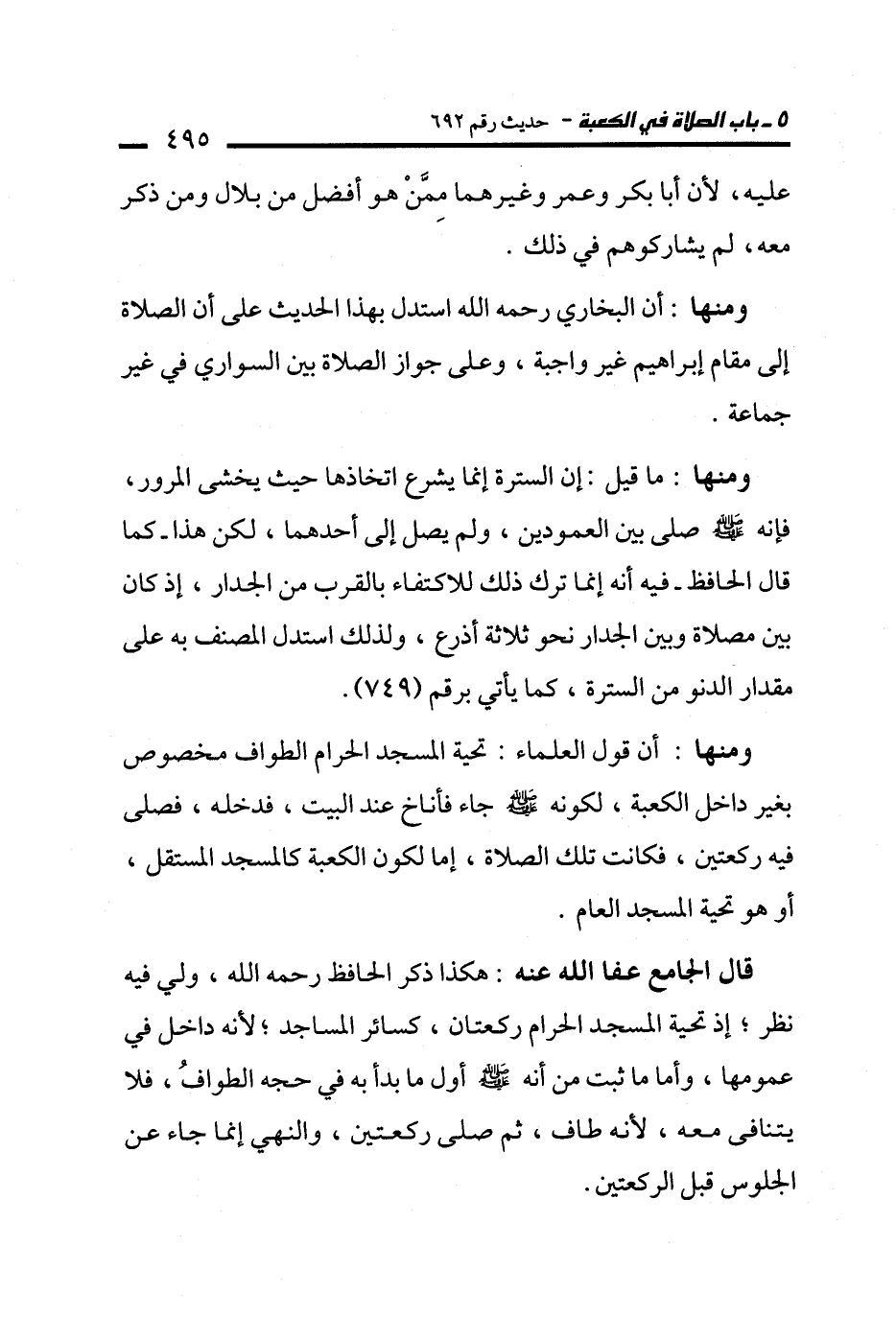 قال الجامع عفا الله سنه: هكذا ذكر الحافظ -رحمه الله-، ولي فيه نظر, إذ تحية المسجد الحرام ركعتان، كسائر المساجد؛ لأنه داخل في عمومها، وأما ما ثبت من أنه - صلى الله عليه وسلم - أول ما بدأ به في حجه الطوافُ، فلا يتنافى معه؛ لأنه طاف، ثم صلى ركعتين، والنهي إنما جاء عن الجلوس قبل الركعتين.