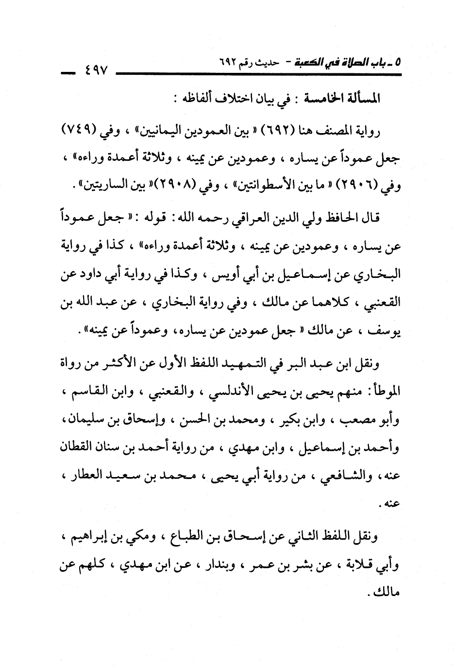 قال الحافظ ولي الدين العراقي -رحمه الله-: قوله: "جعل عمودًا عن يساره، وعمودين عن يمينه، وثلاثة أعمدة وراءه"، كذا في رواية البخاري عن إسماعيل بن أبي أويس، وكذا في رواية أبي داود عن القعنبي، كلاهما عن مالك، وفي رواية البخاري، عن عبد الله بن يوسف، عن مالك "جعل عمودين عن يساره، وعمودًا عن يمينه".
