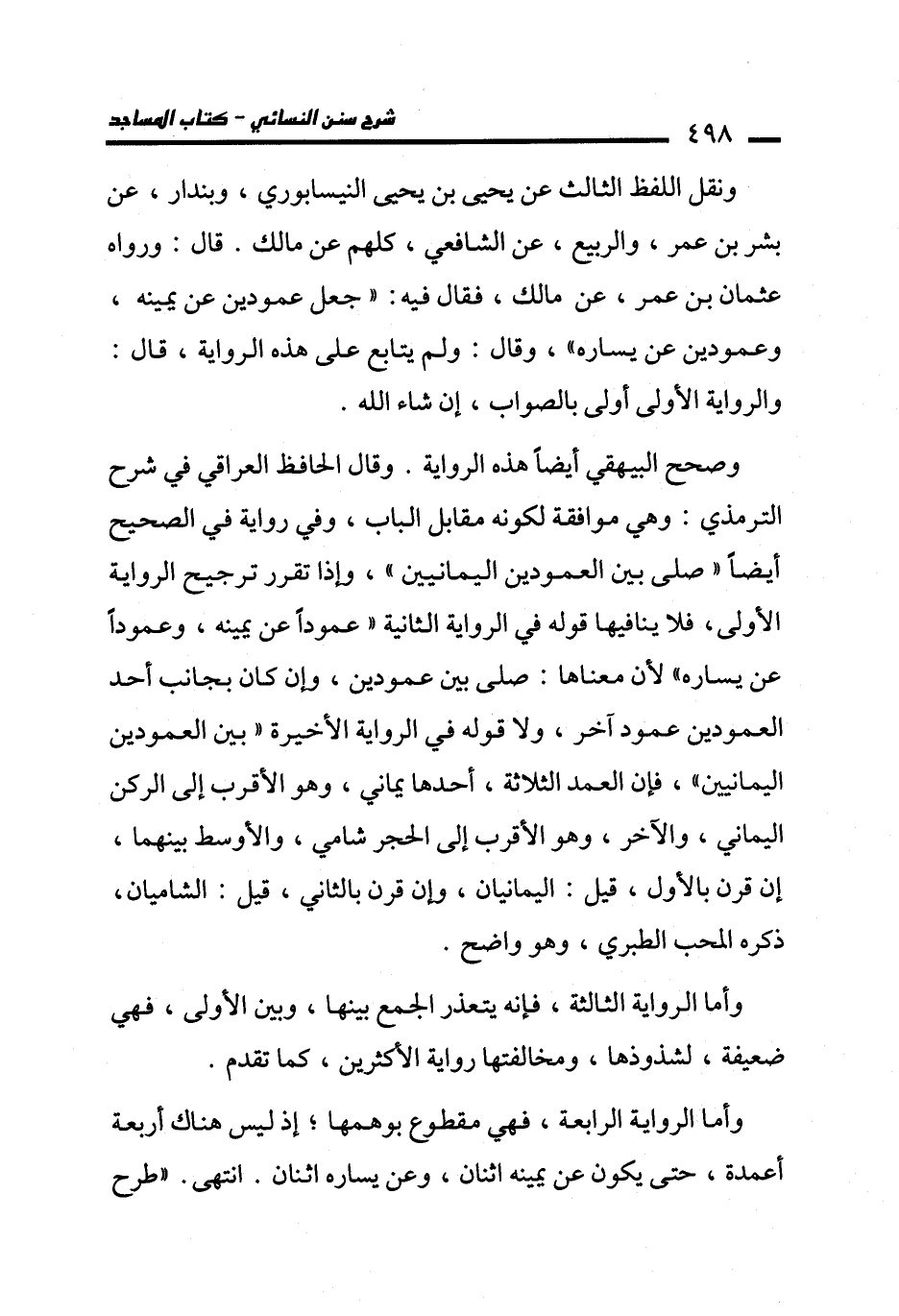 وصحح البيهقي أيضًا هذه الرواية. وقال الحافظ العراقي في شرح الترمذي: وهي موافقة لكونه مقابل الباب، وفي رواية في الصحيح أيضًا "صلى بين العمودين اليمانيين"، وإذا تقرر ترجيح الرواية الأولى، فلا ينافيها قوله في الرواية الثانية "عمودًا عن يمينه، وعمودًا عن يساره" لأن معناها: صلى بين عمودين، وإن كان بجانب أحد العمودين عمود آخر، ولا قوله في الرواية الأخيرة "بين العمودين اليمانيين"، فإن العمد الثلاثة، أحدها يماني، وهو الأقرب إلى الركن اليماني، والآخر، وهو الأقرب إلى الحجر شامي، والأوسط بينهما، إن قرن بالأول، قيل: اليمانيان، وإن قرن بالثاني، قيل: الشاميان، ذكره المحب الطبري، وهو واضح.