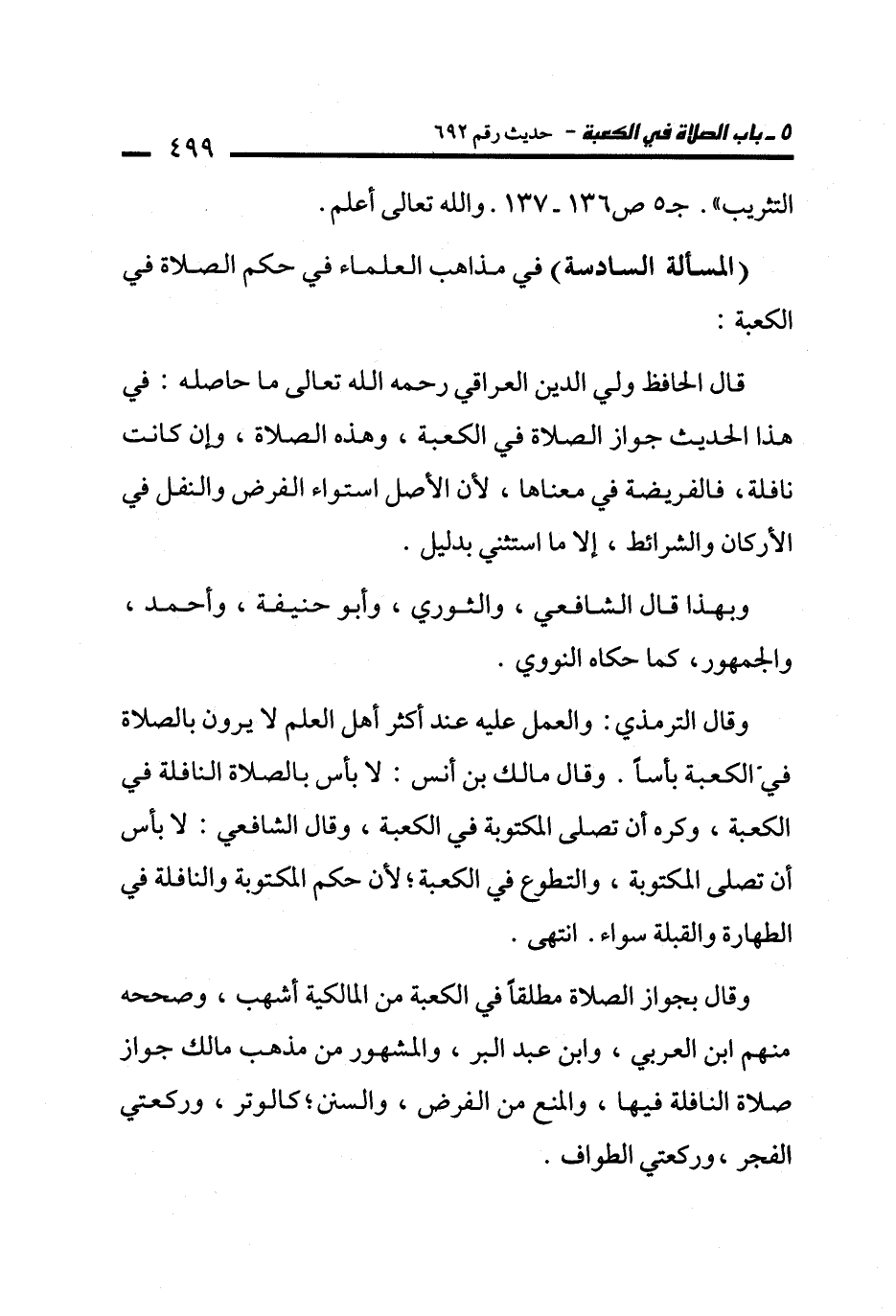 وقال الترمذي: والعمل عليه عند أكثر أهل العلم لا يرون بالصلاة في الكعبة بأسًا. وقال مالك بن أنس: لا بأس بالصلاة النافلة في الكعبة، وكره أن تصلى المكتوبة في الكعبة، وقال الشافعي: لا بأس أن تصلى المكتوبة، والتطوع في الكعبة؛ لأن حكم المكتوبة والنافلة في الطهارة والقبلة سواء. انتهى.