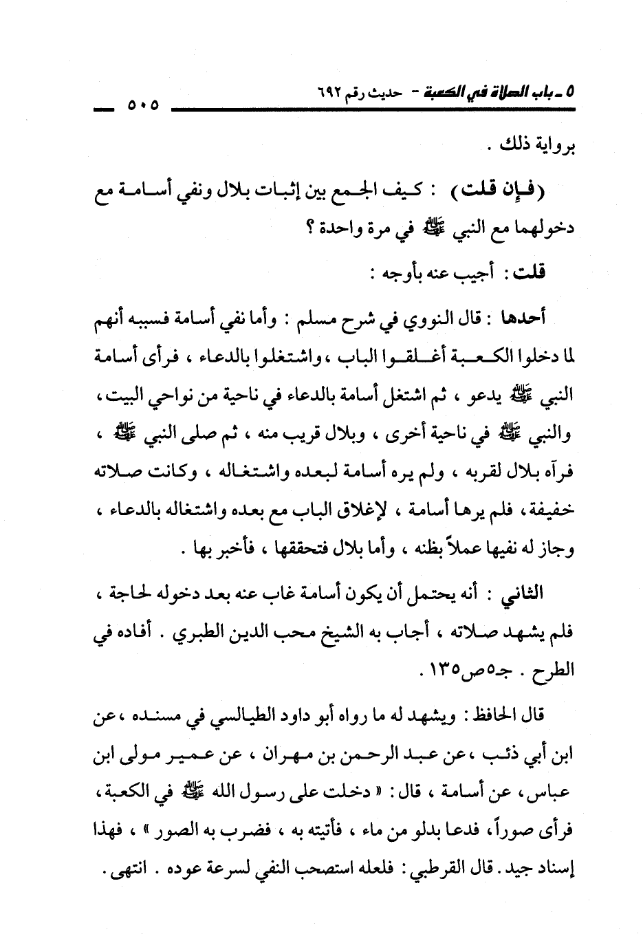 الثاني: أنه يحتمل أن يكون أسامة غاب عنه بعد دخوله لحاجة، فلم يشهد صلاته، أجاب به الشيخ محب الدين الطبري. أفاده في الطرح. جـ 5 ص 135.