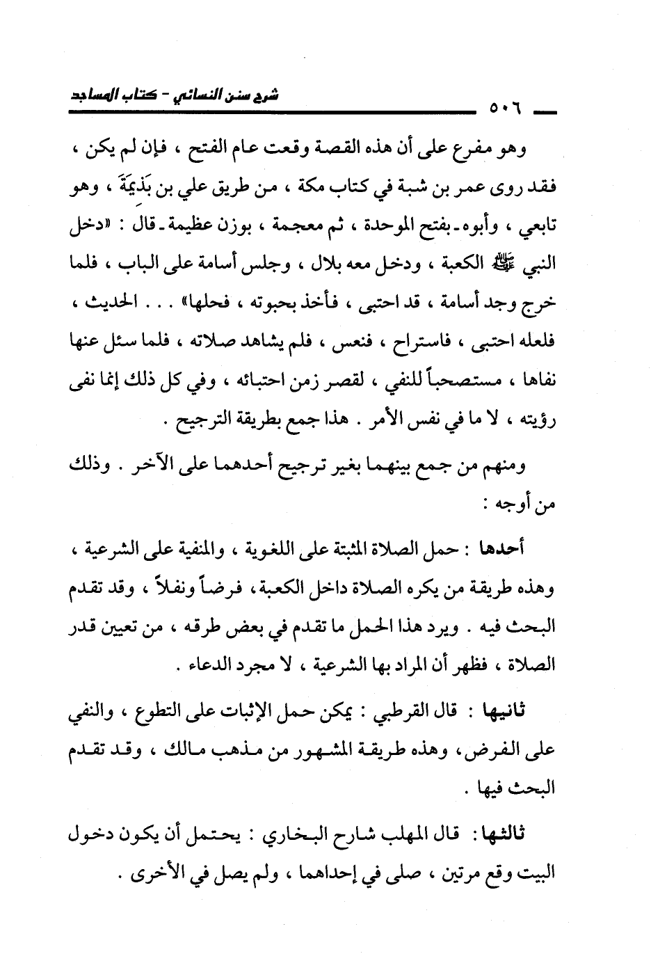 أحدها: حمل الصلاة المثبتة على اللغوية، والمنفية على الشرعية، وهذه طريقة من يكره الصلاة داخل الكعبة، فرضًا ونفلًا، وقد تقدم البحث فيه. ويرد هذا الحمل ما تقدم في بعض طرقه، من تعيين قدر الصلاة، فظهر أن المراد بها الشرعية، لا مجرد الدعاء.