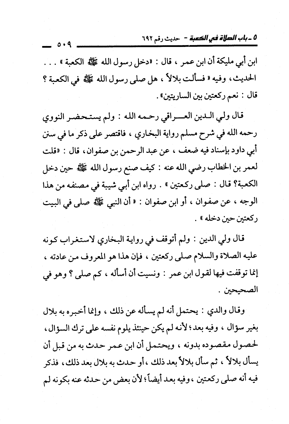 قال ولي الدين العراقي -رحمه الله-: ولم يستحضر النووي -رحمه الله- في شرح مسلم رواية البخاري، فاقتصر على ذكر ما في سنن أبي داود بإسناد فيه ضعف، عن عبد الرحمن بن صفوان، قال: "قلت لعمر بن الخطاب - رضي الله عنه -: كيف صنع رسول الله - صلى الله عليه وسلم - حين دخل الكعبة؟ قال: صلى ركعتين". رواه ابن أبي شيبة في مصنفه من هذا الوجه، عن صفوان، أو ابن صفوان: "أن النبي - صلى الله عليه وسلم - صلى في البيت ركعتين حين دخله".