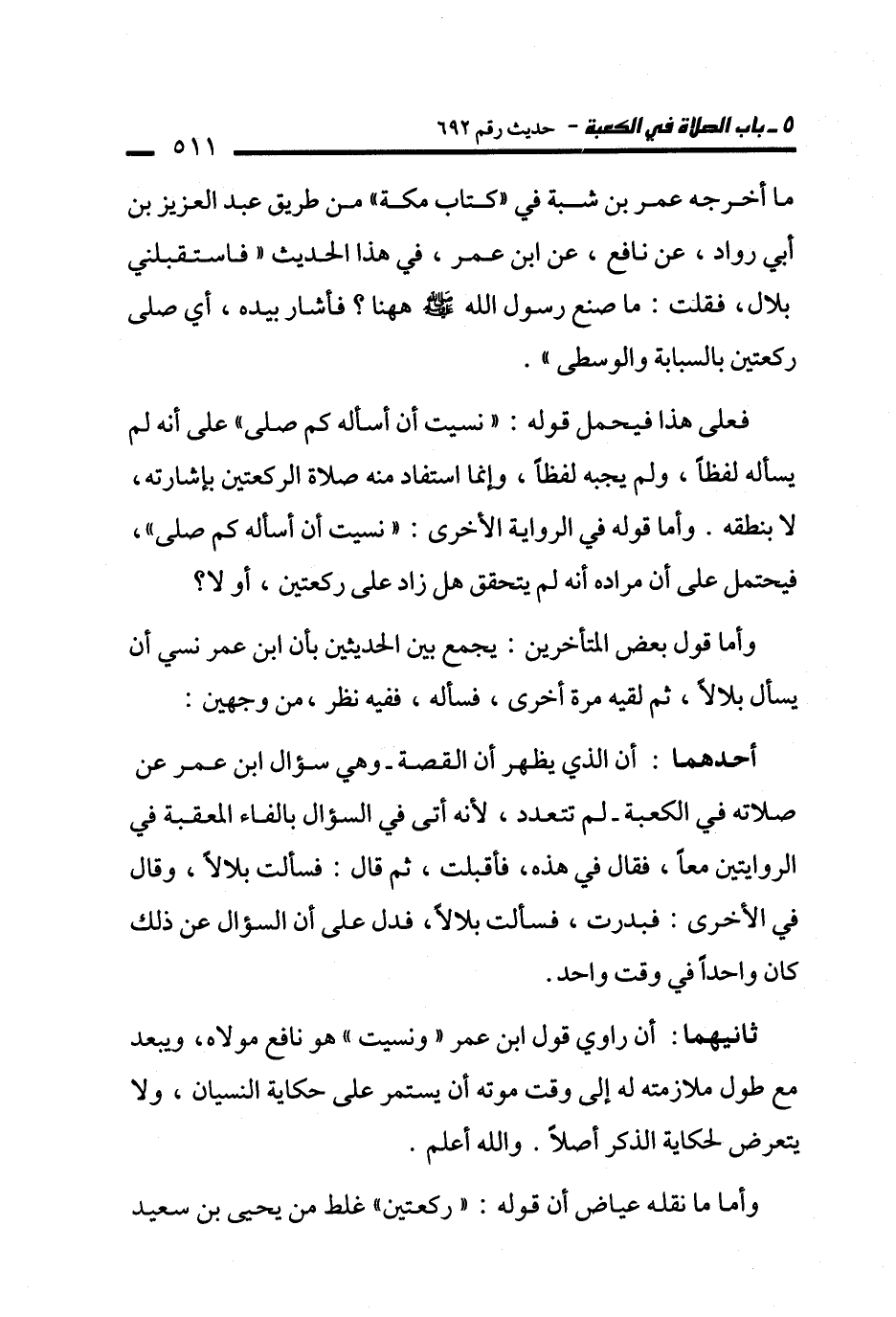 أحدهما: أن الذي يظهر أن القصة -وهي سؤال ابن عمر عن صلاته في الكعبة- لم تتعدد؛ لأنه أتى في السؤال بالفاء المعقبة في الروايتين معًا، فقال في هذه، فأقبلت، ثم قال: فسألت بلالًا، وقال في الأخرى: فبدرت، فسألت بلالًا، فدل على أن السؤال عن ذلك كان واحدًا في وقت واحد.