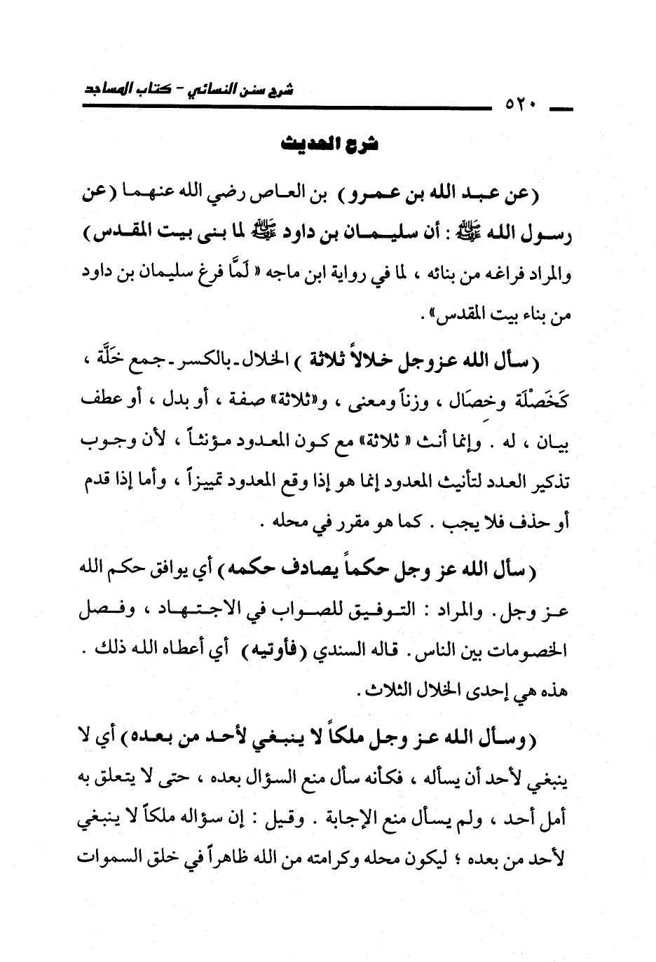 (عن عبد الله بن عمرو) بن العاص - رضي الله عنهما - (عن رسول الله - صلى الله عليه وسلم -: أن سليمان بن داود - صلى الله عليه وسلم - لما بني بيت المقدس) والمراد فراغه من بنائه، لما في رواية ابن ماجه "لَمَّا فرغ سليمان بن داود من بناء بيت المقدس".