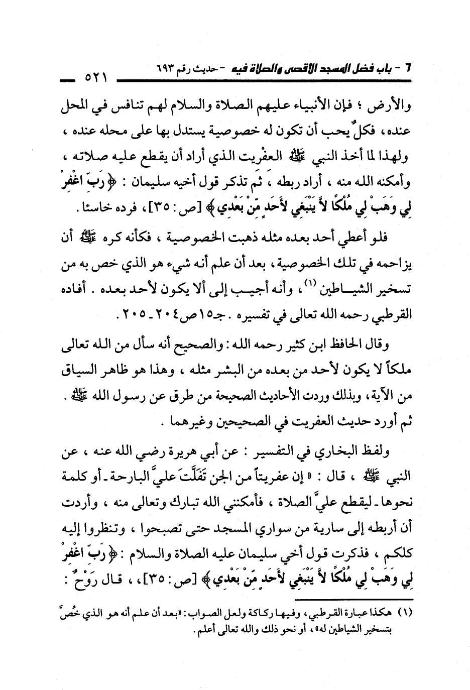 ولفظ البخاري في التفسير: عن أبي هريرة - رضي الله عنه -، عن النبي - صلى الله عليه وسلم -، قال: "إن عفريتًا من الجن تَفَلَّتَ عليَّ البارحة -أو كلمة نحوها- ليقطع عليَّ الصلاة، فأمكنني الله تبارك وتعالى منه، وأردت أن أربطه إلى سارية من سواري المسجد حتى تصبحوا، وتنظروا إليه كلكم، فذكرت قول أخي سليمان عليه الصلاة والسلام: {رَبِّ اغْفِرْ لِي وَهَبْ لِي مُلْكًا لَا يَنْبَغِي لِأَحَدٍ مِنْ بَعْدِي} [ص: 35]، قال رَوْحٌ: