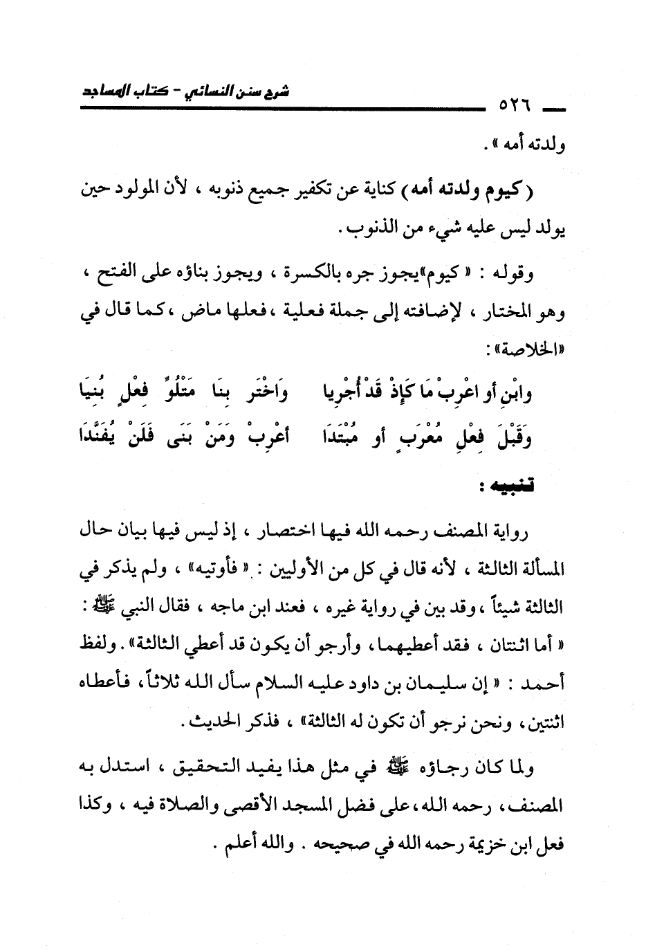 ولما كان رجاؤه - صلى الله عليه وسلم - في مثل هذا يفيد التحقيق، استدل به المصنف، -رحمه الله-، على فضل المسمجد الأقصى والصلاة فيه، وكذا فعل ابن خزيمة -رحمه الله- في صحيحه. والله أعلم.
