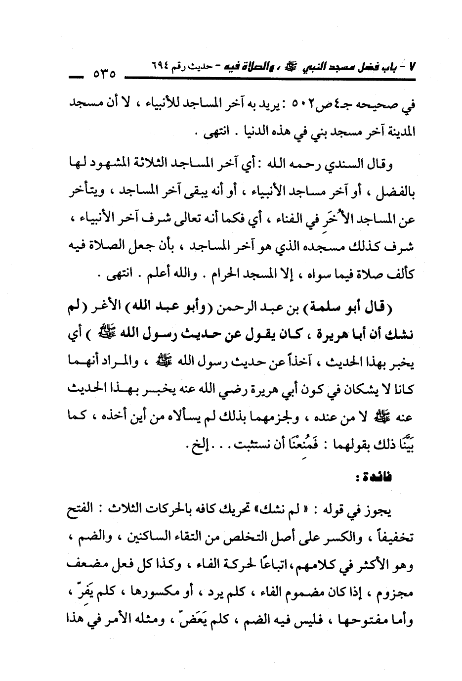 في صحيحه جـ 4 ص 502: يريد به آخر المساجد للأنبياء، لا أن مسجد المدينة آخر مسجد بني في هذه الدنيا. انتهى.