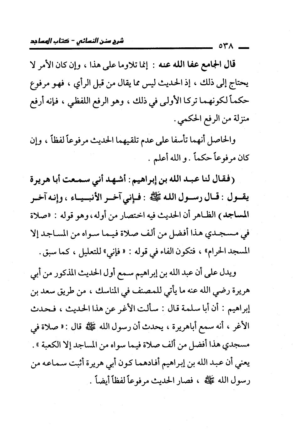 ويدل على أن عبد الله بن إبراهيم سمع أول الحديث المذكور من أبي هريرة - رضي الله عنه - ما يأتي للمصنف في المناسك، من طريق سعد بن إبراهيم: أن أبا سلمة قال: سألت الأغر عن هذا الحديث، فحدث الأغر، أنه سمع أبا هريرة، يحدث أن رسول الله - صلى الله عليه وسلم - قال: "صلاة في مسجدي هذا أفضل من ألف صلاة فيما سواه من المساجد إلا الكعبة".