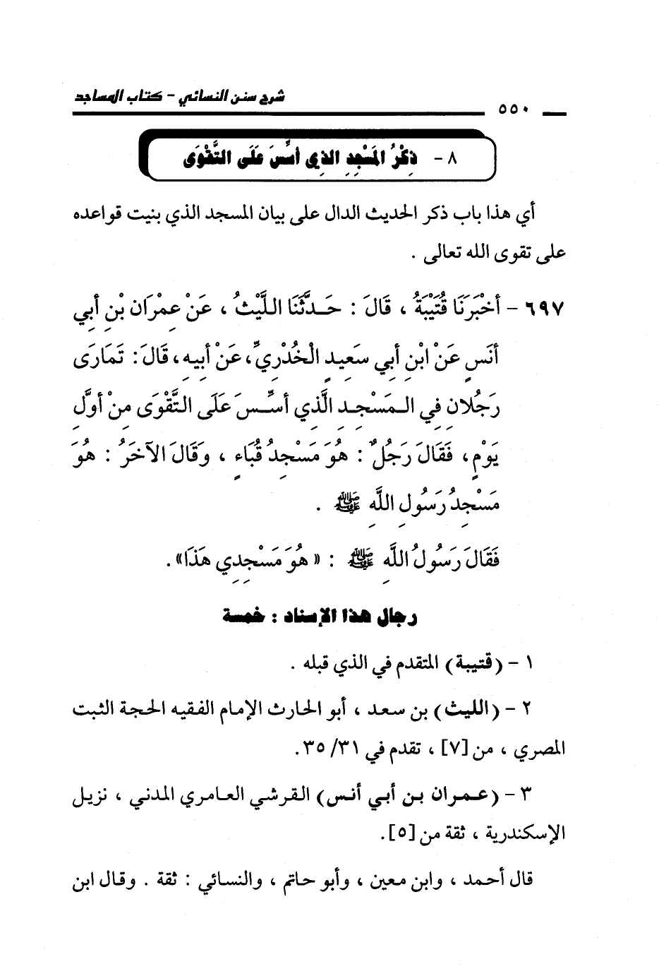 697 - أَخْبَرَنَا قُتَيْبَةُ، قَالَ: حَدَّثَنَا اللَّيْثُ، عَنْ عِمْرَانَ بْنِ أَبِي أَنَسٍ عَنِ ابْنِ أَبِي سَعِيدٍ الْخُدْرِيِّ، عَنْ أَبِيهِ، قَالَ: تَمَارَى رَجُلاَنِ فِي الْمَسْجِدِ الَّذِي أُسِّسَ عَلَى التَّقْوَى مِنْ أَوَّلِ يَوْمٍ، فَقَالَ رَجُلٌ: هُوَ مَسْجِدُ قُبَاءٍ، وَقَالَ الآخَرُ: هُوَ مَسْجِدُ رَسُولِ اللَّهِ - صلى الله عليه وسلم -.